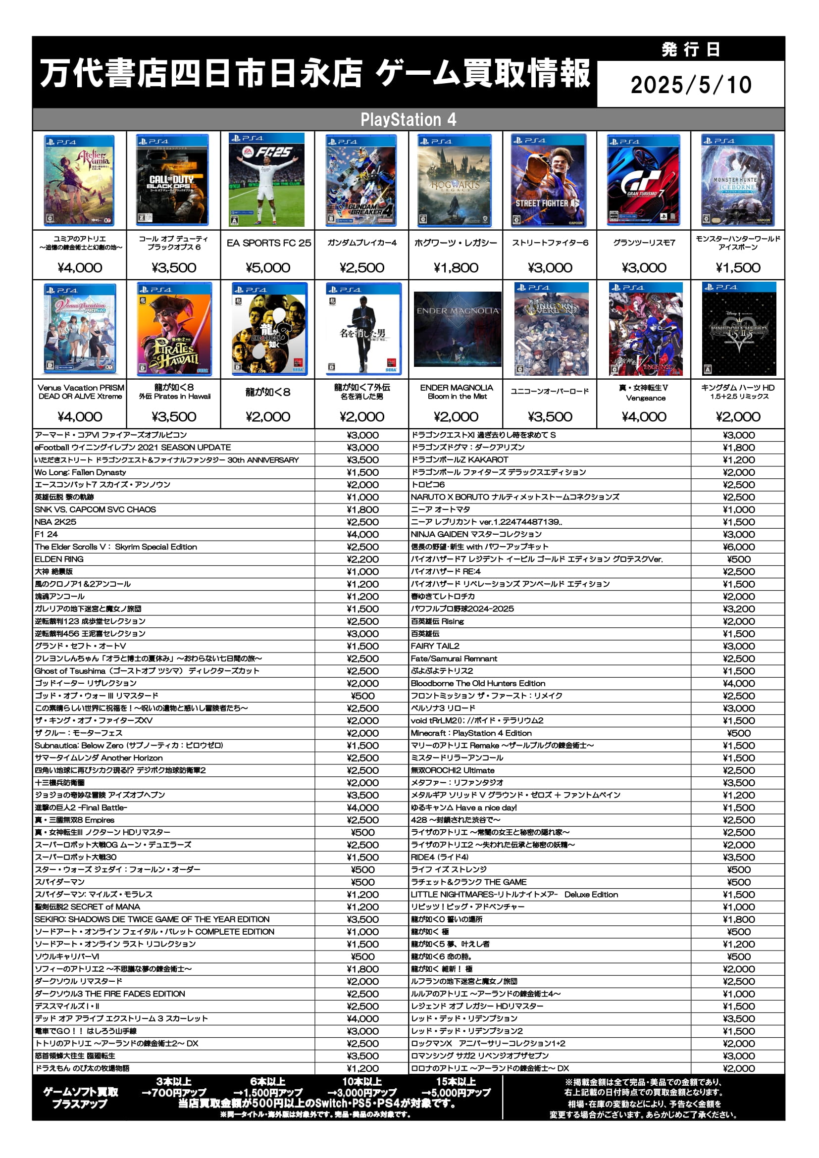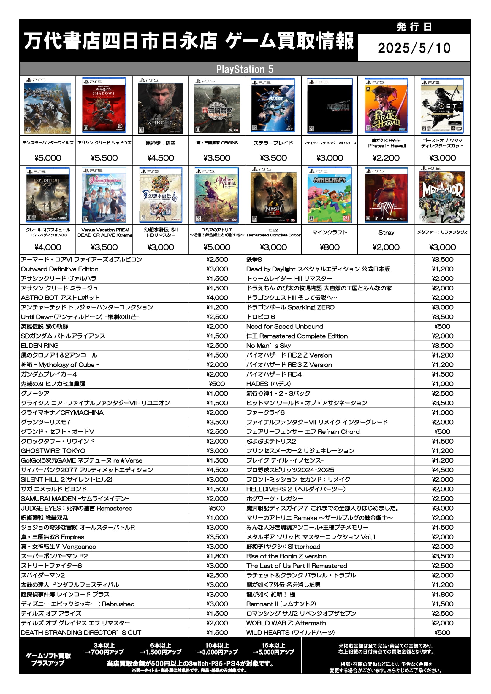 【四日市日永店】ゲーム買取情報更新いたしました🙌 万代書店四日市日永店 四日市日永店 買取情報 四日市日永店 ゲーム 2025年5月10日 日永店ゲーム🎮🎮 📢ゲーム買取情報更新いたしました🙌✨✨✨ ※2025/5/10 現在の価格となります。 在庫状況・状態によってお値段が変動いたします。予めご了承ください。 ………………………………………………… 楽天はこちらから! amazonはこちらから!