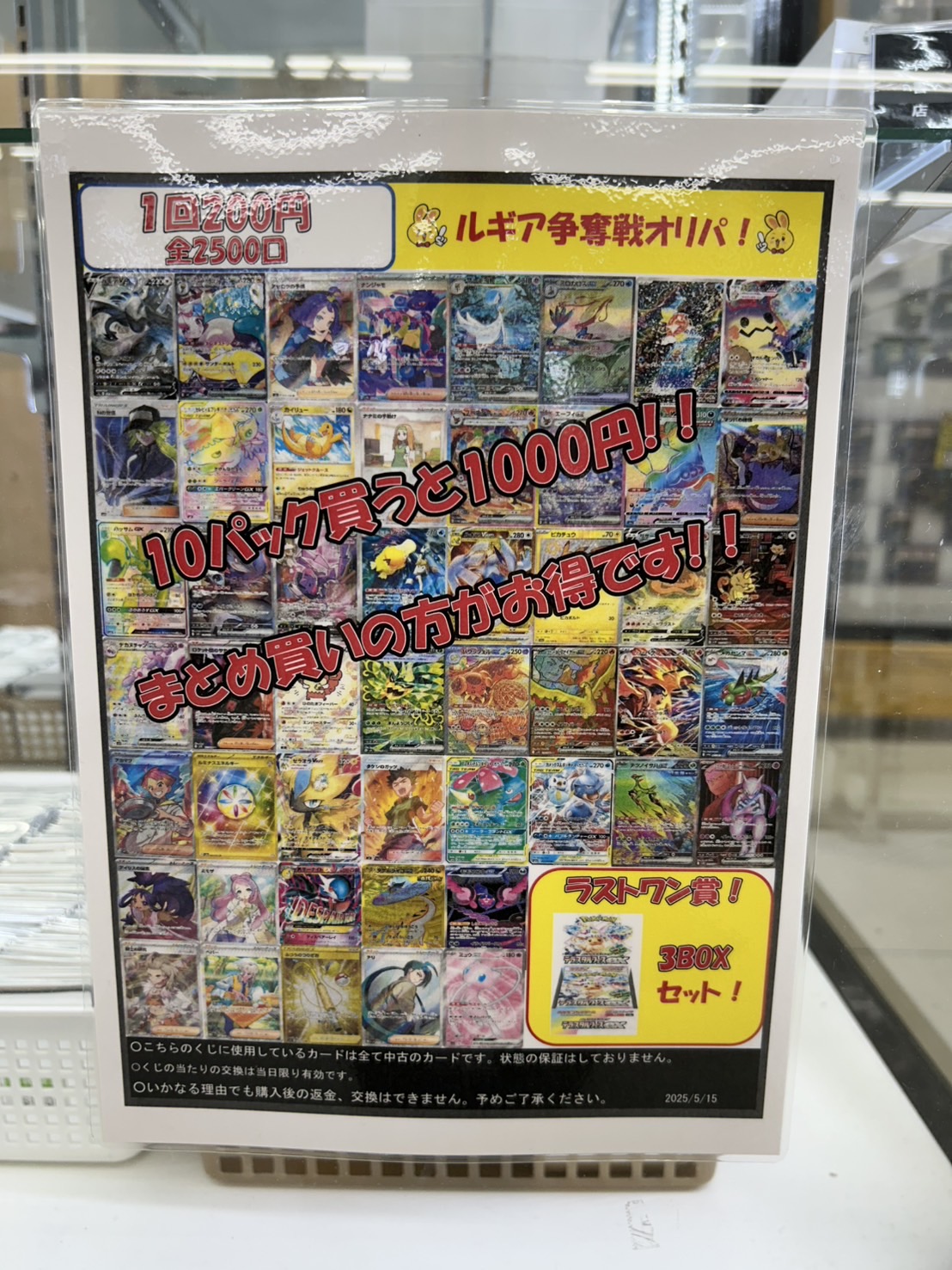 【鈴鹿店】カードコーナーより! ポケカルギア争奪戦オリパ発売中! 万代書店鈴鹿店 鈴鹿店 カード 2025年5月15日 カードコーナーより! ポケカルギア争奪戦オリパ発売中! 1回200円 全2500口! 10パック買うと1000円になって超お得✨ 当たりはルギアSRやナンジャモSARなど🤩 ラストワン賞はテラスタルフェス3BOXです!