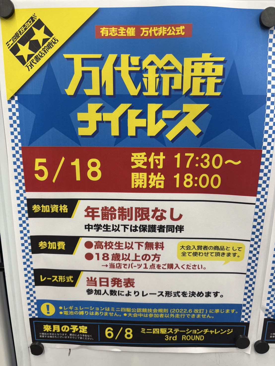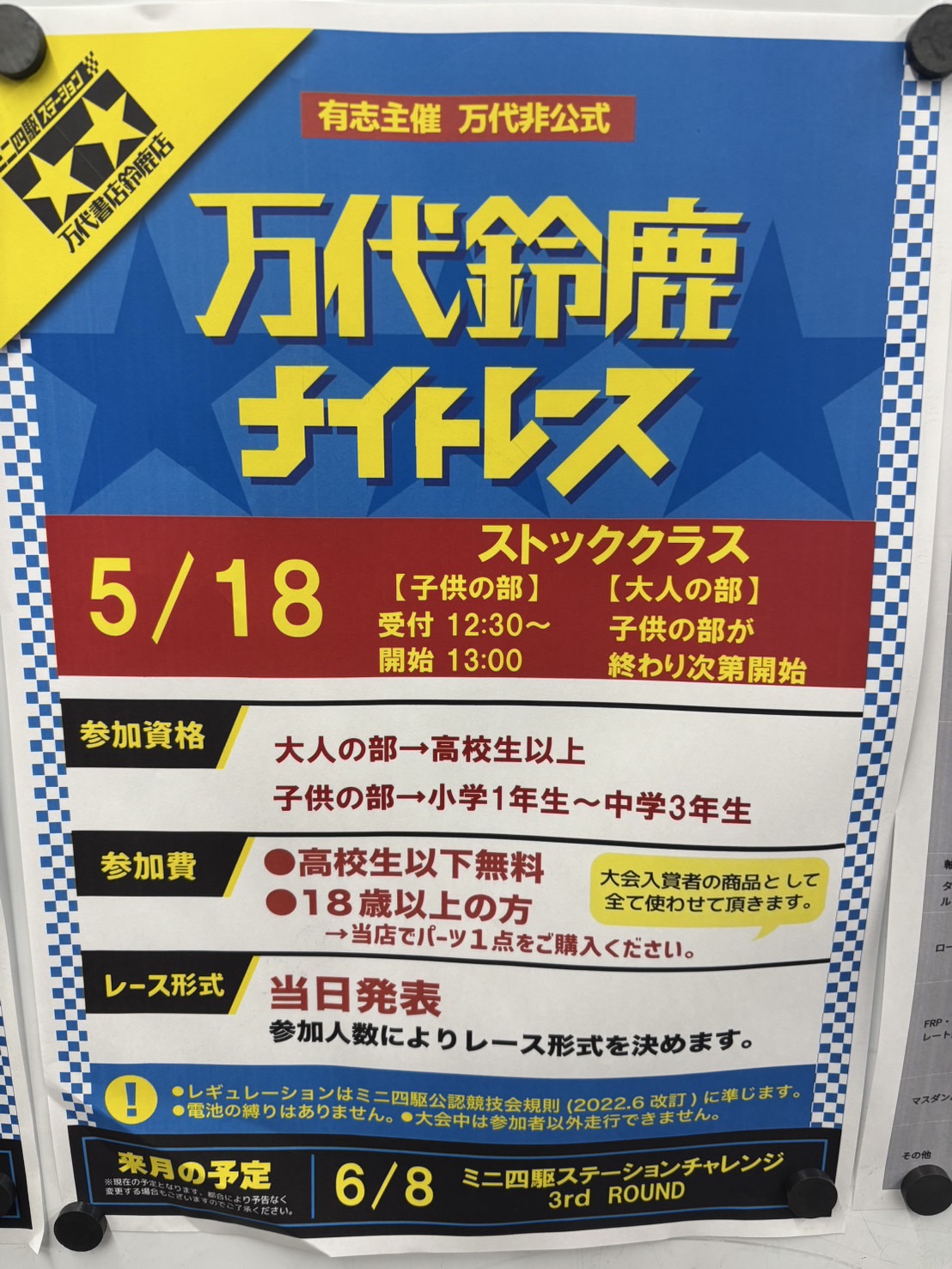 【鈴鹿店】ミニ四駆コーナー、コース変更していただきました! 万代書店鈴鹿店 鈴鹿店 おもちゃ 2025年5月16日 ミニ四駆コーナー、コース変更していただきました! 今週末は月例レースの他に、新開催のストッククラスも開催されますので、ぜひご参加ください!