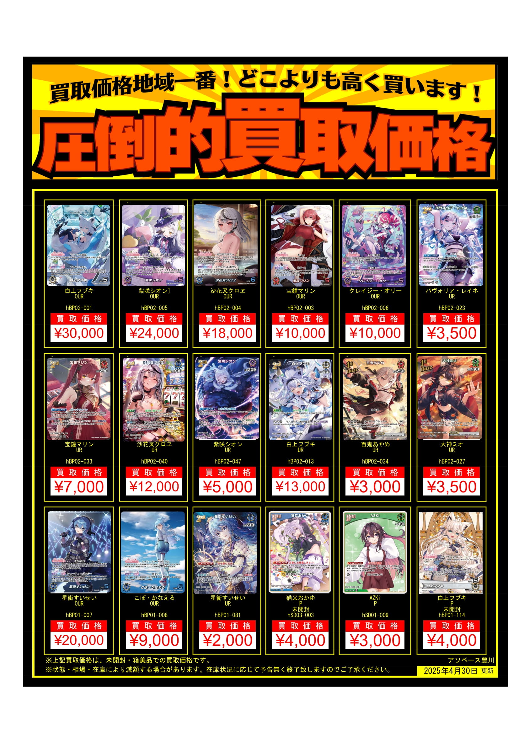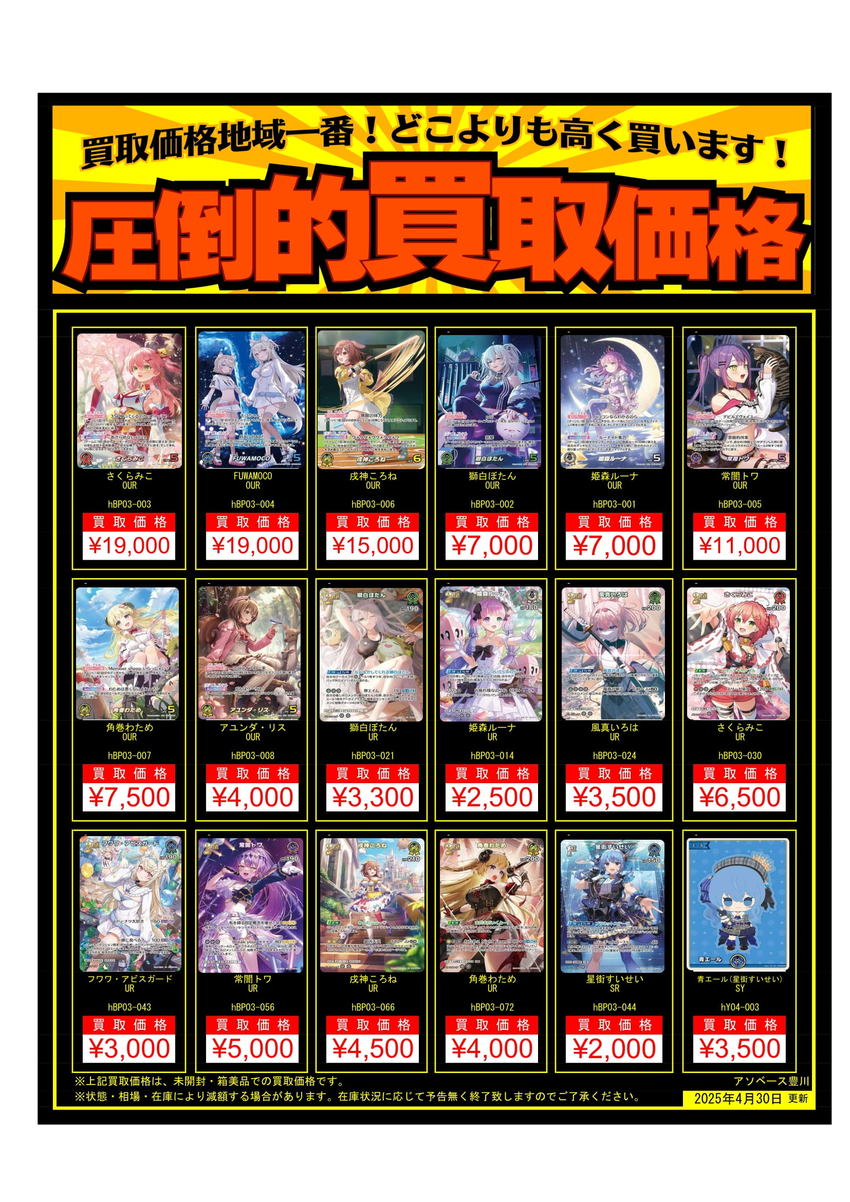 【アソベース豊川店】#ホロライブocg #ホロカ 🚀買取表更新🚀 アソベース豊川店 豊川店 買取情報 豊川店 カード 2025年5月17日 🚀買取表更新🚀 ホロカ買取表更新です⭐️ ホロカめちゃめちゃ頑張ってます💪 表記内も表記外も一枚からでもOK🙆♀️ ぜひお持ち込みください🙏 ※2025/5/17現在の価格となります。 在庫状況・状態によってお値段が変動いたします。予めご了承ください。 **************** こちら↓もぜひチェックしてみてくださいね♪(*´▽`*) ・最新のイベント情報はこちら ・最新の買取情報はこちら