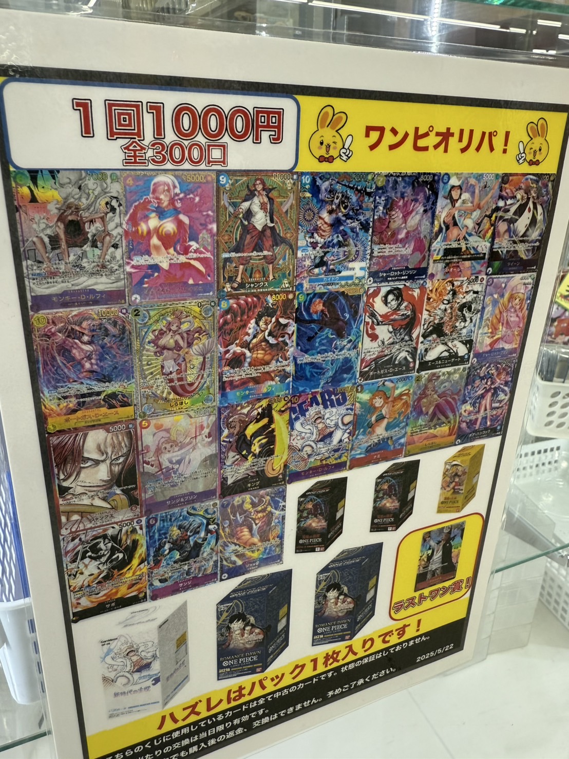 【鈴鹿店】カードコーナーより! ワンピオリパ発売中! 万代書店鈴鹿店 鈴鹿店 カード 2025年5月22日 カードコーナーより! ワンピオリパ発売中! 1回1000円 全300口! 当たりはルフィのコミパラ✨ ラストワン賞はシャンクスコミパラ✨ハズレはパックが1枚入っています!