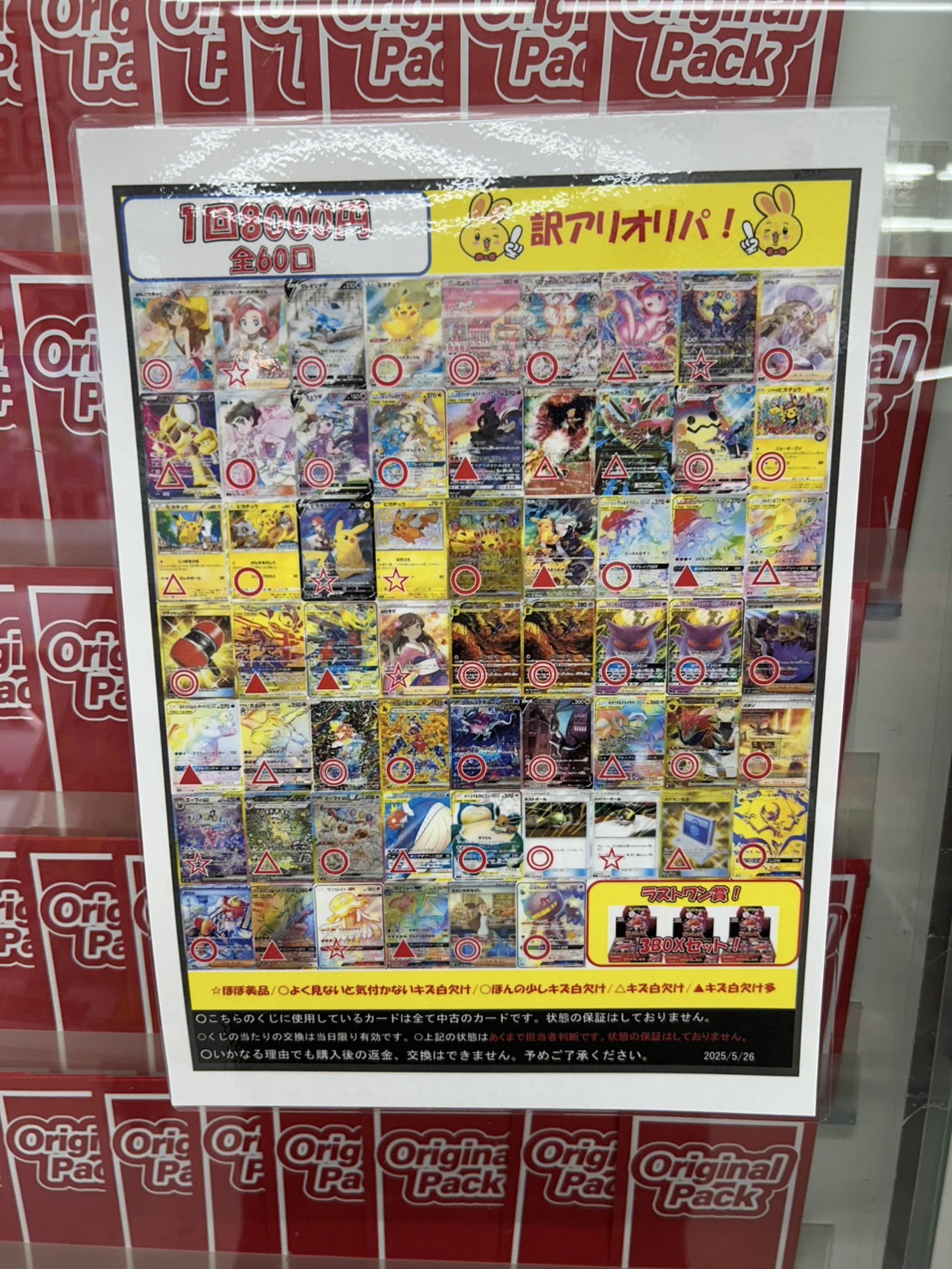 【鈴鹿店】カードコーナーより! ポケカ訳アリオリパ発売中! 万代書店鈴鹿店 鈴鹿店 カード 2025年5月26日 カードコーナーより! ポケカ訳アリオリパ発売中! 1回8000円 全60口! かんこうきゃくSRやミュウVMAX HR、ブラッキーSARなど✨ 訳アリですが、訳アリの中でも美品あります! ラストワン賞はロケット団の栄光3BOXです!