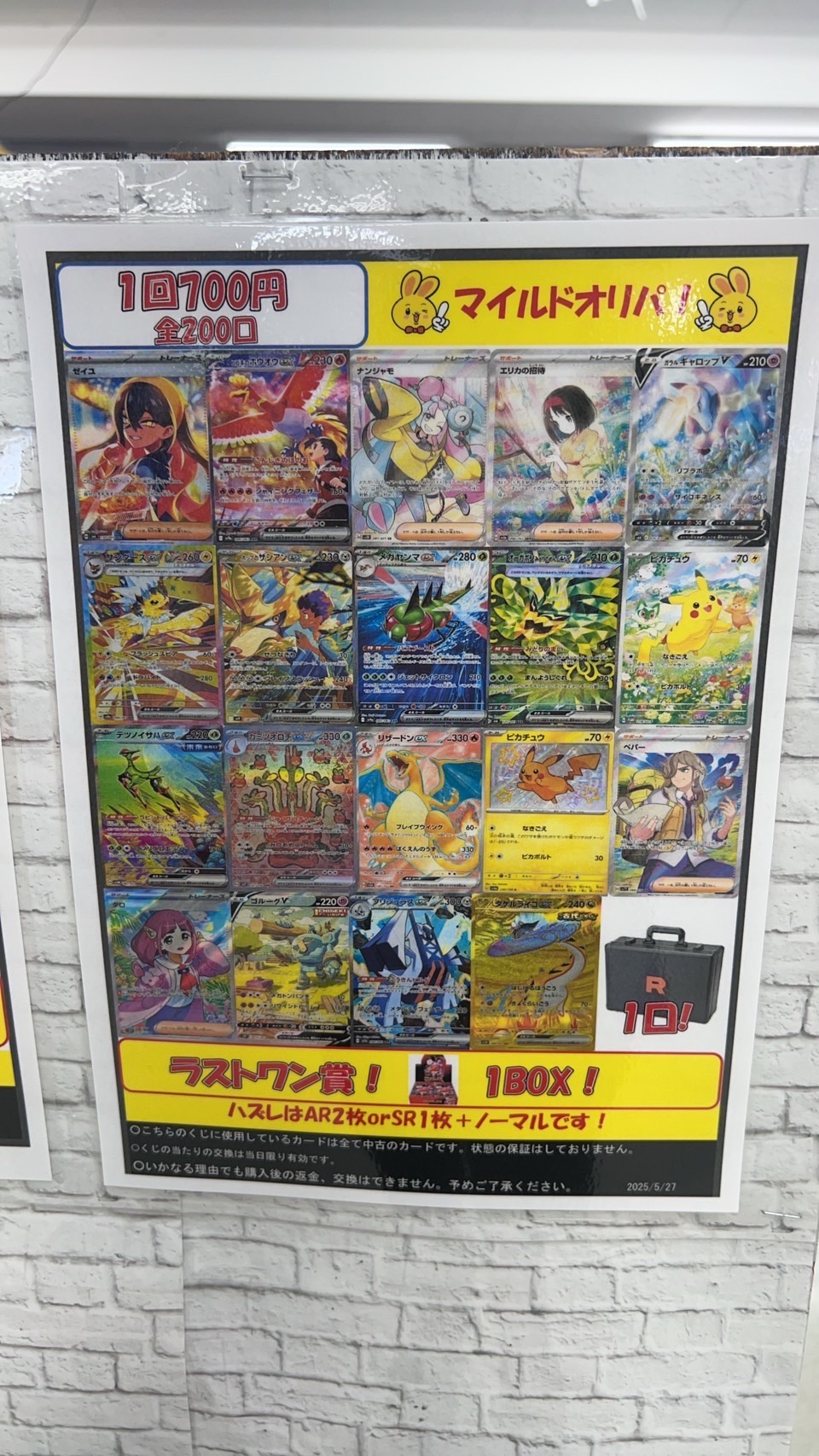 【鈴鹿店】マイルドオリパ発売中! 万代書店鈴鹿店 鈴鹿店 カード 2025年5月28日 カードコーナーより! マイルドオリパ発売中! 1回700円 全200口! ロケット団の栄光アタッシュケースやゼイユSAR、ヒビキのホウオウSARなど🤩 ハズレはAR2枚orSR1枚確定です! ラストワン賞はロケット団の栄光1BOXです!
