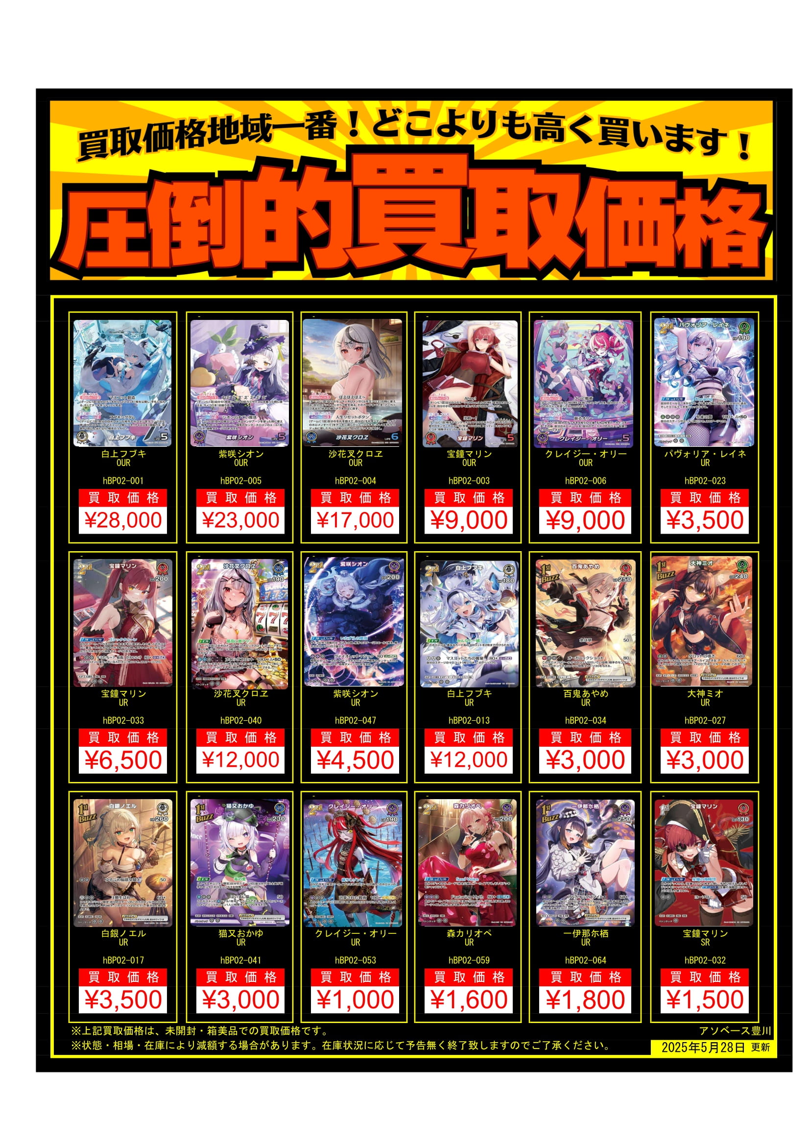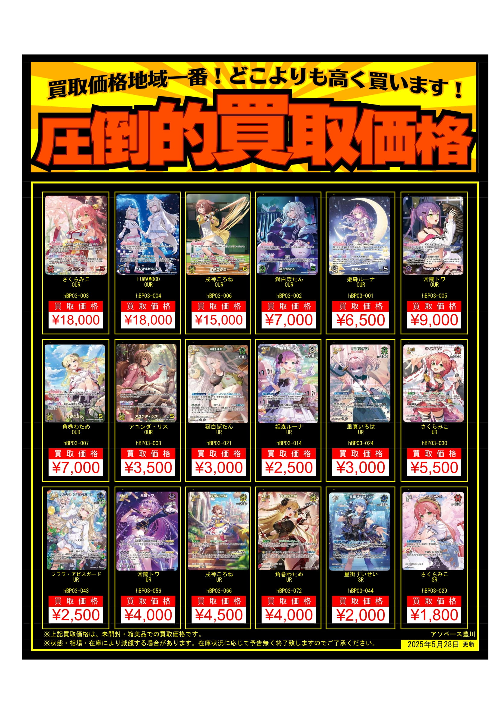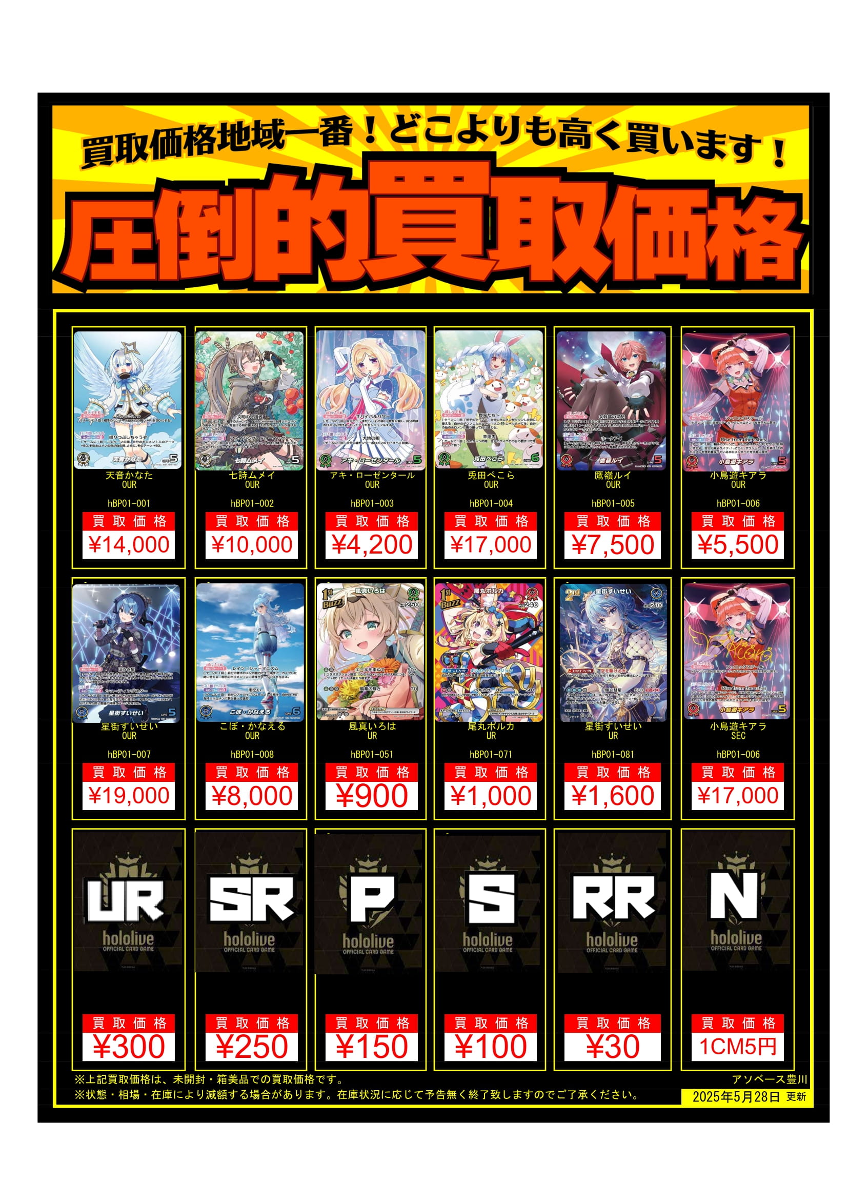 【アソベース豊川店】ホロカ大・大・大告知! #ホロカ #ホロライブocg アソベース豊川店 豊川店 買取情報 豊川店 カード 2025年5月29日 ✨ホロカ大・大・大告知!✨ 欲しい、欲しい、カードが欲しい! 一枚からでも、表記外でもどんどんお持ち込みください! 皆様のお持ち込みお待ちしております🙏 ホロカ買うのも売るのもアソベース🚀 ※2025/5/29現在の価格となります。 在庫状況・状態によってお値段が変動いたします。予めご了承ください。 **************** こちら↓もぜひチェックしてみてくださいね♪(*´▽`*) ・最新のイベント情報はこちら ・最新の買取情報はこちら