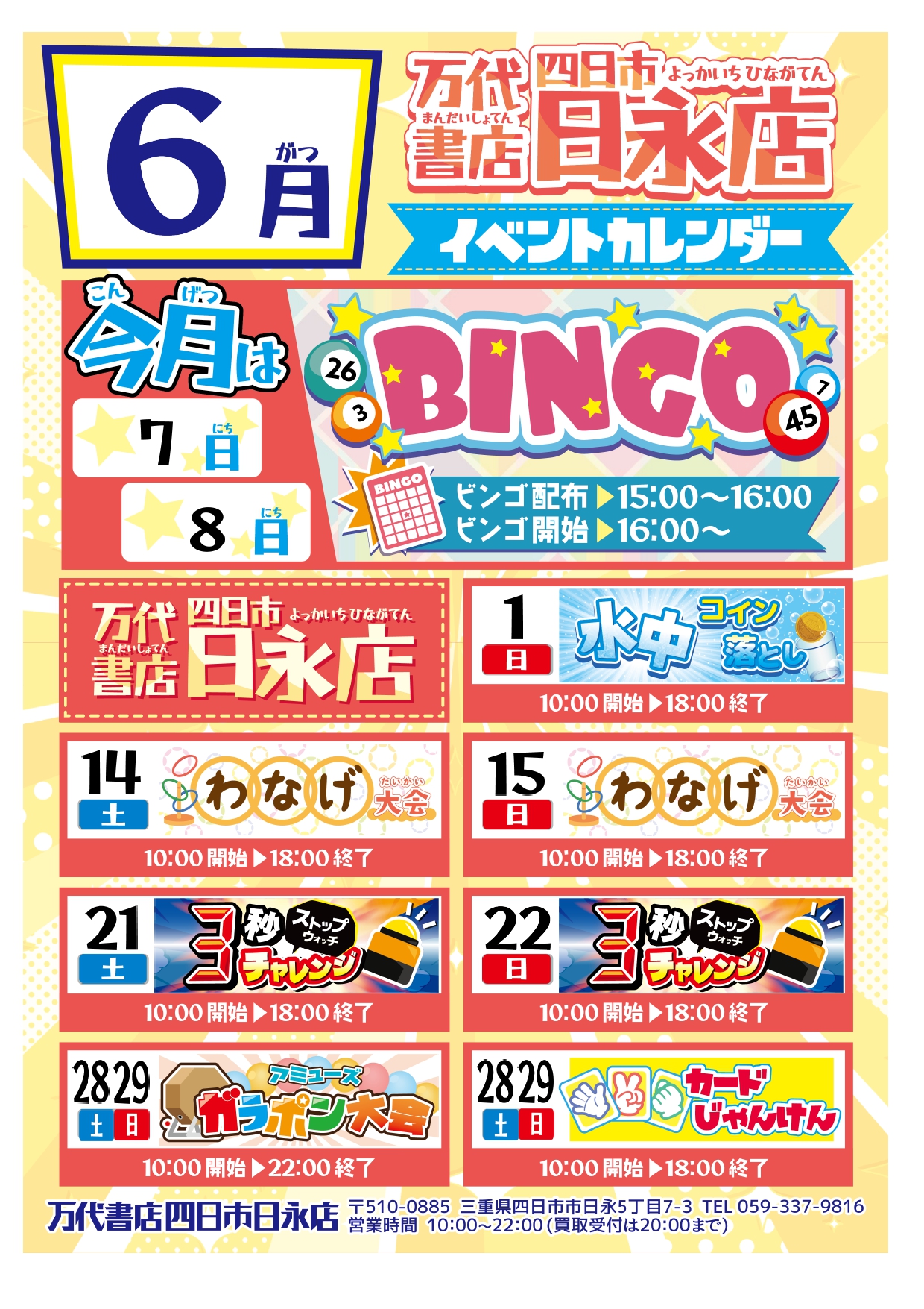 【四日市日永店】6 月イベントカレンダー new 万代書店四日市日永店 四日市日永店 イベント情報 2025年5月31日 🌟万代日永店イベントカレンダー🌟 **************** こちら↓もぜひチェックしてみてくださいね♪(*´▽`*) ・最新のイベント情報はこちら ・最新の買取情報はこちら