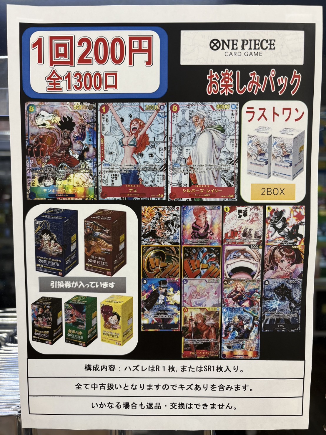 【四日市日永店】ワンピースカードお楽しみパック作成いたしました‼️ 万代書店四日市日永店 四日市日永店 カード 四日市日永店 ガチャ 2025年6月4日 ワンピースカード1回200円 全1300口お楽しみパック作成いたしました‼️ もしかしたら200円でコミパラが当たるかも?! 運試しにいかがでしょうか✨ ………………………………………………… 楽天はこちらから! amazonはこちらから!