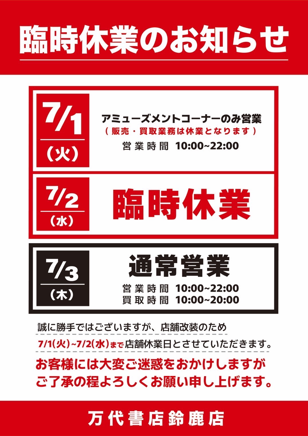 【鈴鹿店】臨時休業のお知らせです。 7月1日(火)・2日(水)は店舗改装のため営業内容を変更させていただきます。 万代書店鈴鹿店 鈴鹿店 お知らせ/ご案内 2025年6月23日 臨時休業のお知らせです。 7月1日(火)・2日(水)は店舗改装のため営業内容を変更させていただきます。 7月1日(火) アミューズメントコーナーのみ営業 販売・買取業務は休業となります。 7月2日(水) 臨時休業 終日全ての営業をお休みさせていただきます。 お客様にはご迷惑をお掛け致しますが、ご理解のほどよろしくお願いいたします。 7月3日(木)よりオープンさせていただきますが、進行具合によっては一部売場を閉鎖させていただく場合もございます。