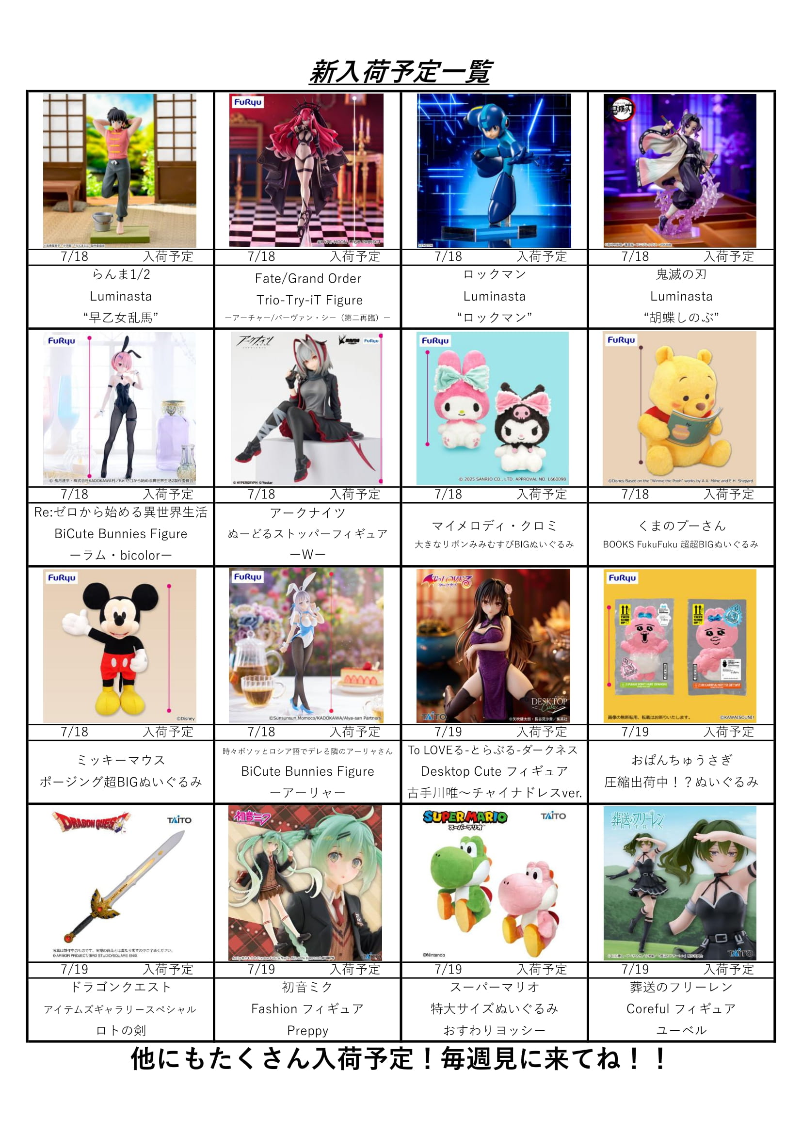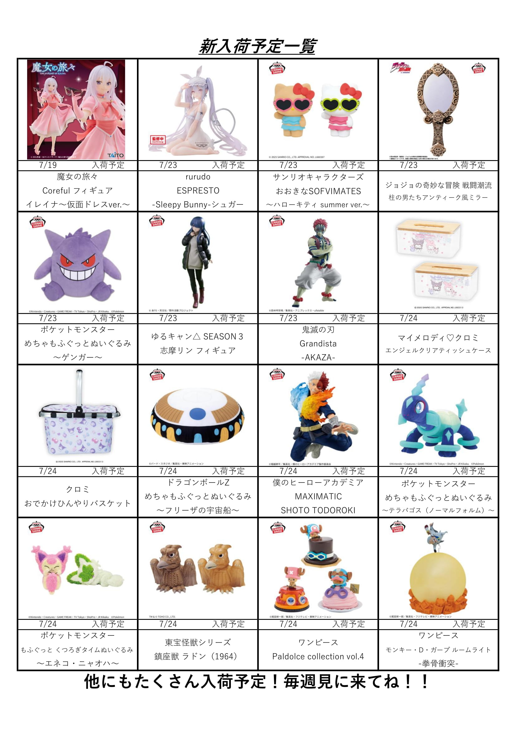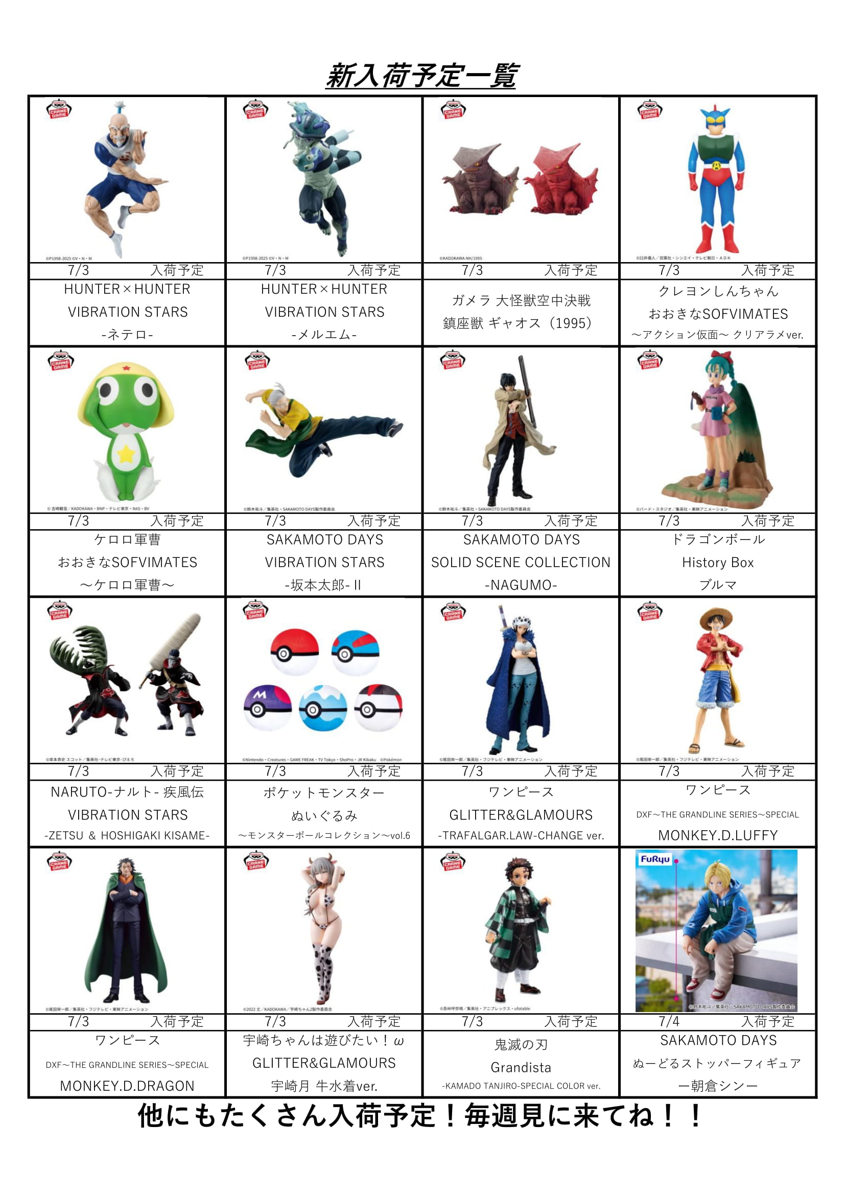 クレーンゲームコーナー7月入荷表!