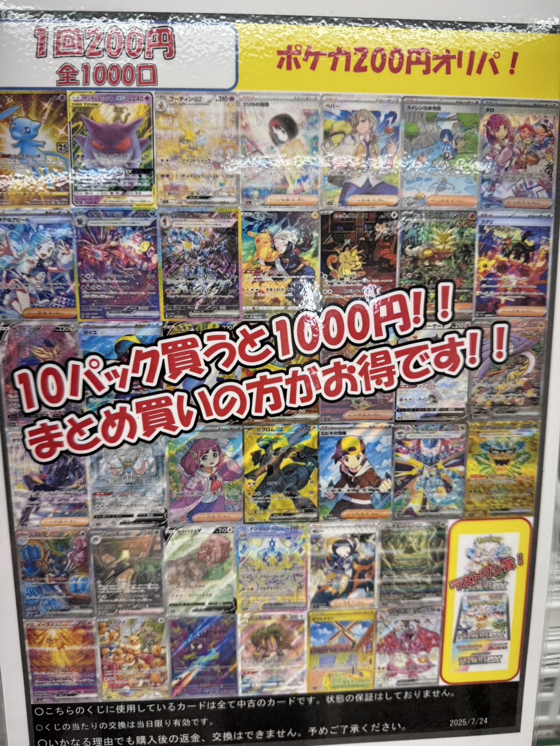 【鈴鹿店】ポケカ200円オリパ発売中! 万代書店鈴鹿店 鈴鹿店 カード 2025年8月1日 カードコーナーより! ポケカ200円オリパ発売中! 1回200円 全1000口 更に10パック買うと1000円! まとめ買いの方がお得です! ミュウURやゲンガー&ミミッキュ当たります! ラストワン賞はテラスタルフェスBOXです!