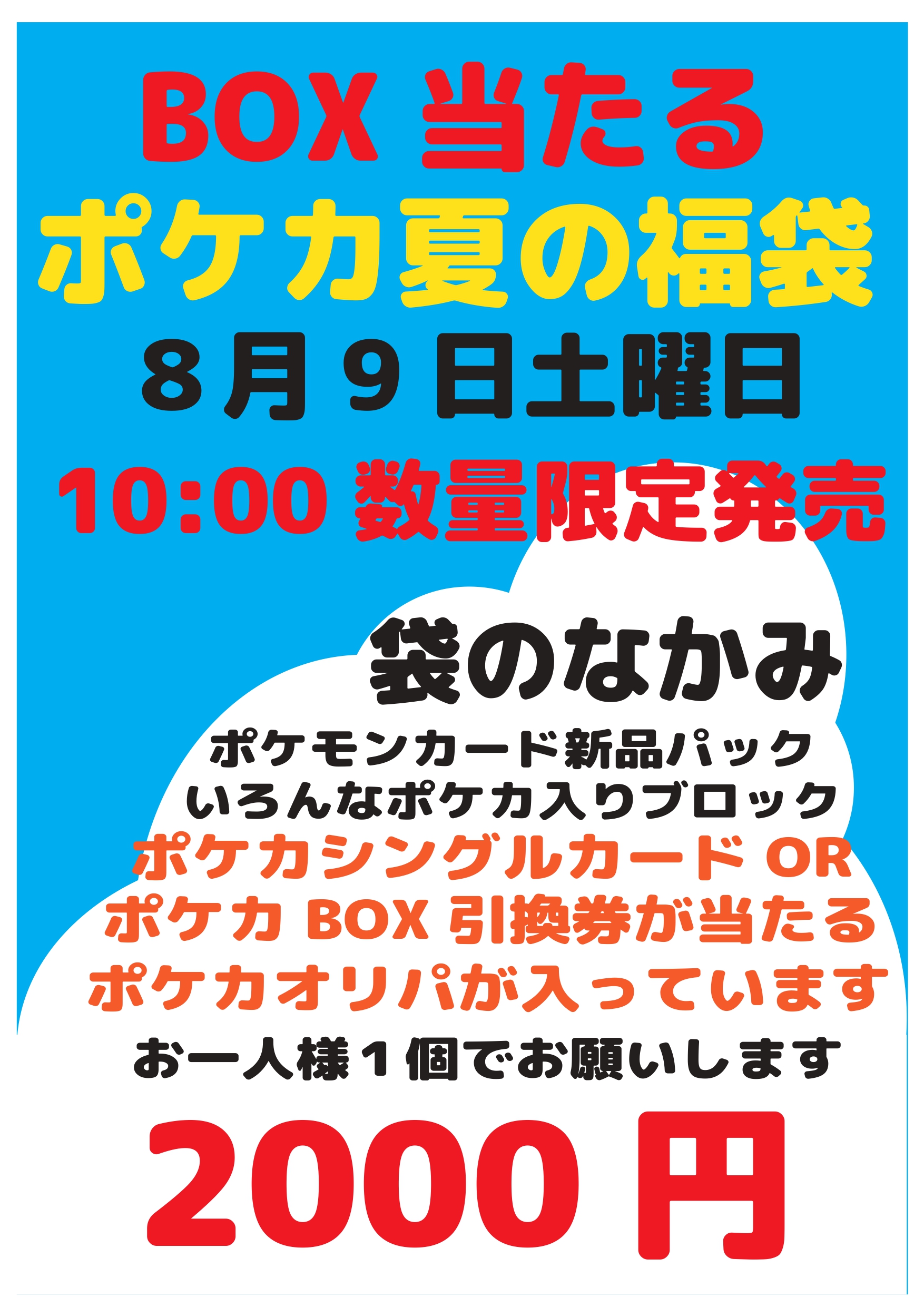 【アソベース豊川店】ポケモンカード夏の福袋発売!! アソベース豊川店 豊川店 カード 2025年8月5日 お盆限定ポケモンカード夏の福袋発売!! 1袋2000円 数量限定です 人気のポケモンカードBOXも当たります!!