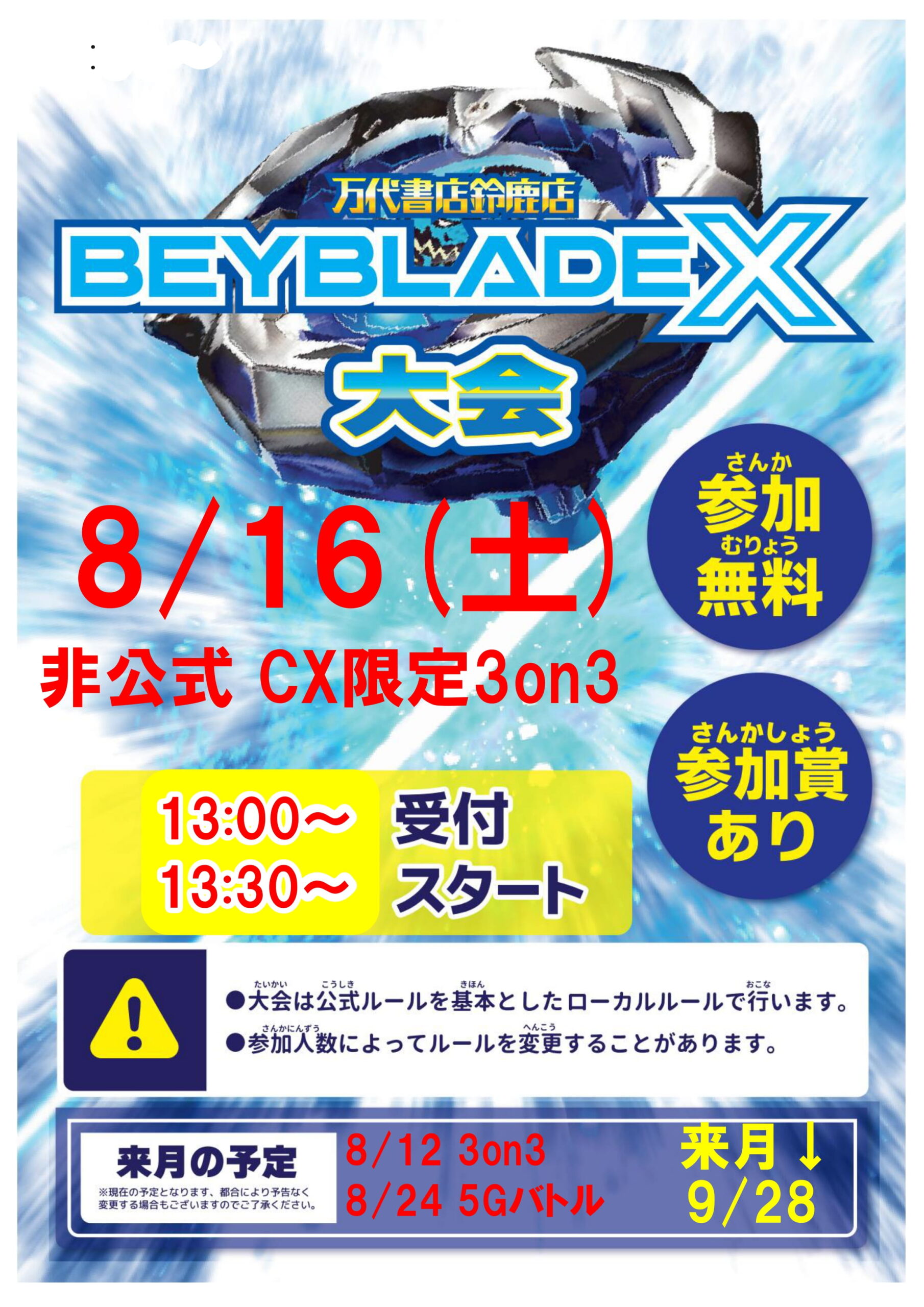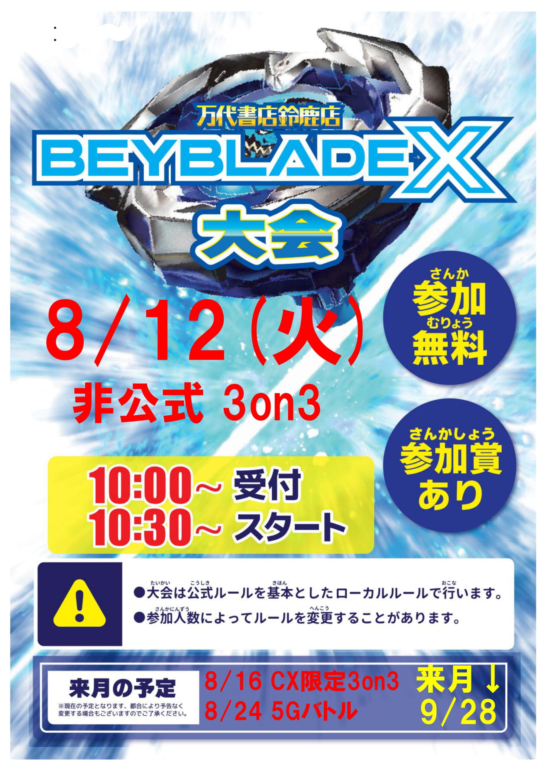 【鈴鹿店】《8月12日・16日・24日》ベイブレードX非公式大会のお知らせ!■ 万代書店鈴鹿店 鈴鹿店 イベント情報 鈴鹿店 おもちゃ 2025年8月6日 ベイブレードX非公式大会のお知らせ! 8月は豪華3本だてでお送りします♪♪ 8/12(火)3on3 受付10時〜 開始10時30分〜 8/16(土)CX限定3on3 受付13時〜 開始13時30分〜 8/24(日)毎月恒例5Gバトル 受付10時〜 開始10時30分〜 全大会参加賞・入賞商品あります! 小学生以下・中学生以上の部で分けて開催するので、始めたばかりという方でも大歓迎です! 夏休みも万代鈴鹿でベイ活しましょう!!