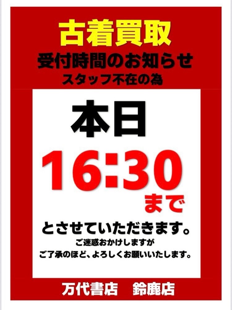 【鈴鹿店】本日8月10日(日)の古着の査定受付時間を 10:00〜16:30と変更させていただきます■ 万代書店鈴鹿店 鈴鹿店 買取情報 鈴鹿店 お知らせ/ご案内 鈴鹿店 ファッション 2025年8月10日 いつも万代書店 鈴鹿店をご利用いただき、誠にありがとうございます❗🙇 本日8月10日(日)の古着の査定受付時間を10:00〜16:30と変更させていただきます。 お客様にはご迷惑をお掛けいたしますが、ご理解・ご了承のほどよろしくお願いいたします。