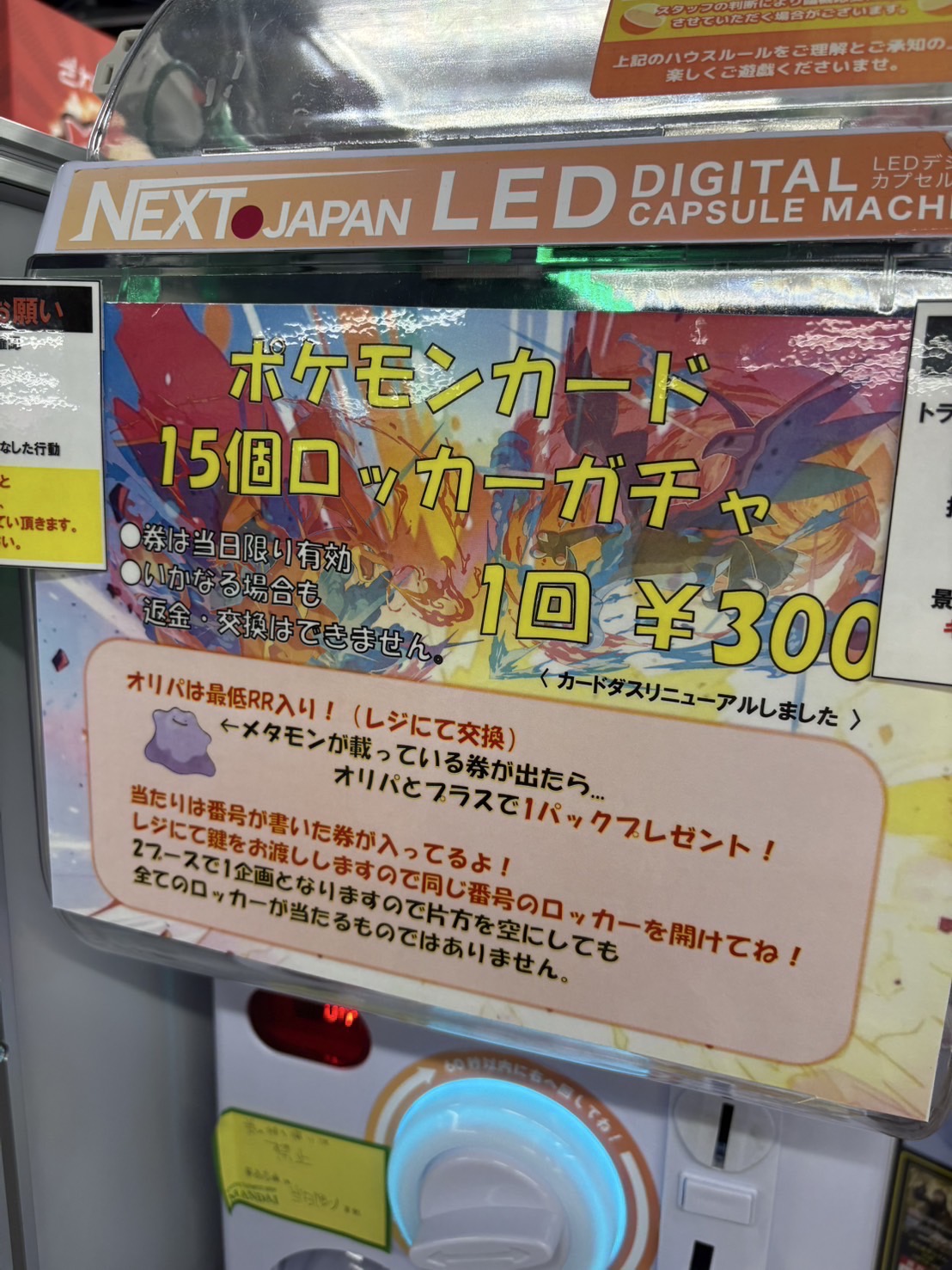 【四日市日永店】1回300円15個ロッカーガチャ 売り切れたので補充しました‼️‼️ 万代書店四日市日永店 四日市日永店 カード 四日市日永店 ガチャ 2025年8月12日 カード 1回300円15個ロッカーガチャ 売り切れたので補充しました‼️‼️ 今回の当たりはこちらです✨️✨️ メタモンが載っている券が出たらオリパとプラスで1パックプレゼントいたします🎁 挑戦してみてください🔥🔥