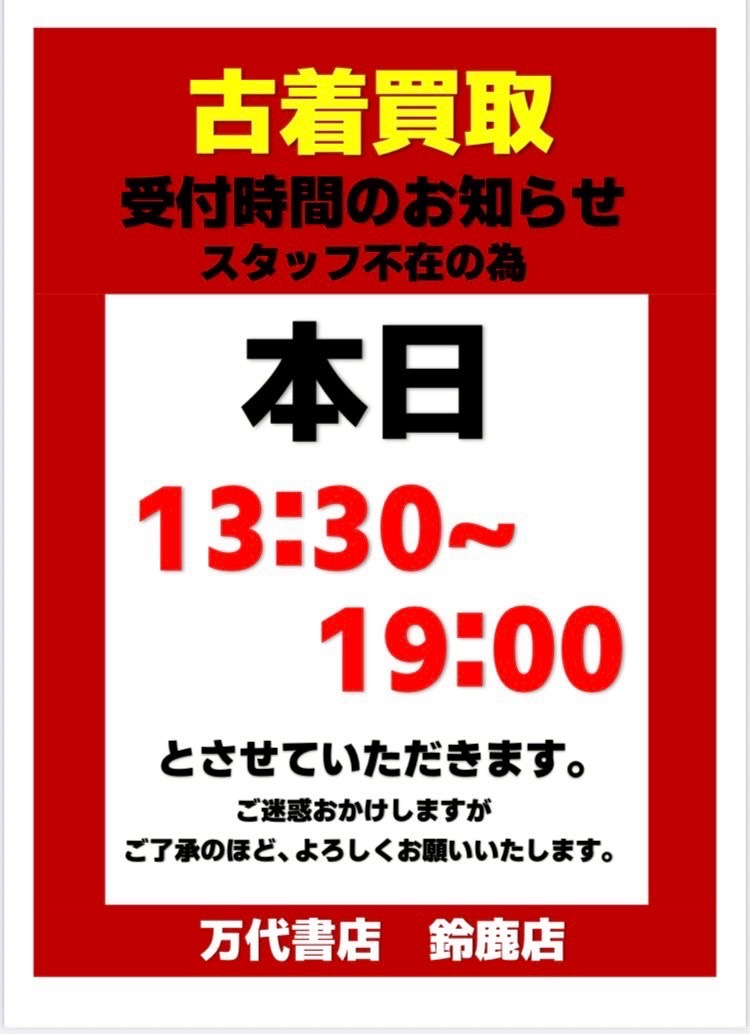 【鈴鹿店】古着の査定受付時間変更のお知らせ☆★ 万代書店鈴鹿店 鈴鹿店 買取情報 鈴鹿店 お知らせ/ご案内 鈴鹿店 ファッション 2025年8月17日 いつも万代書店 鈴鹿店をご利用いただき、誠にありがとうございます❗🙇 本日8月17日(日)の古着の査定受付時間を 13:30〜1900と変更させていただきます。 お客様にはご迷惑をお掛けいたしますが、ご理解・ご了承のほどよろしくお願いいたします。