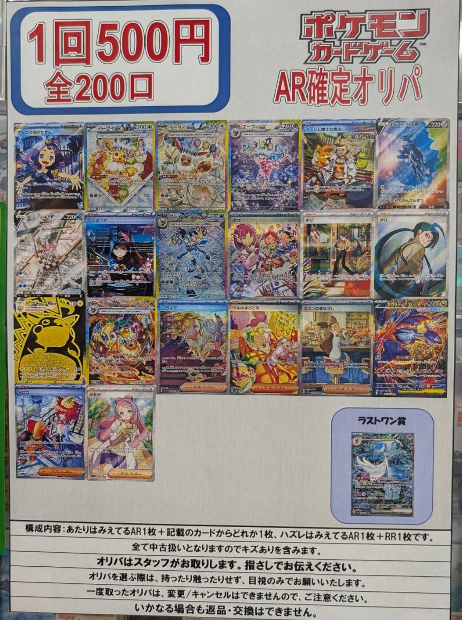【四日市日永店】一回500円AR確定オリパ 前回は超絶大好評につき半日で売り切れてしまったので もう一回つくりました💪💪 万代書店四日市日永店 四日市日永店 カード 2025年8月17日 カード 一回500円AR確定オリパ 前回は超絶大好評につき半日で売り切れてしまったので もう一回つくりました💪💪 推しポケARを選ぶのか🤔 直感でコレ!と決めるのか🤔 ぜひ挑戦しにきてください🫶