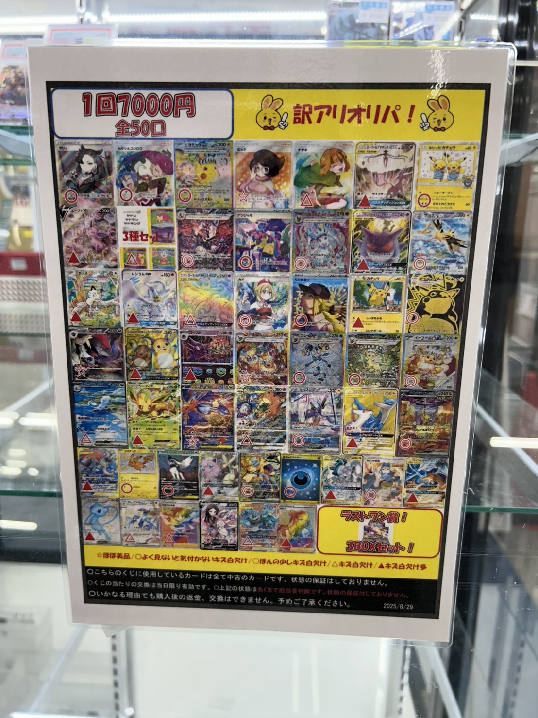 【鈴鹿店】《マイルドオリパ|ポケカ訳アリオリパ》発売中! 万代書店鈴鹿店 鈴鹿店 カード 2025年8月29日 カードコーナーより! マイルドオリパ発売中! 1回700円 全200口 ポケモンカードゲームclassicやレシラムSAR、ナンジャモのハラバリーexSARなどが当たるチャンス🌟 ラストワン賞はブラックボルト1BOXです🤩 ポケカ訳アリオリパ発売中! 1回7000円 全50口 マリィ SRやムサシとコジロウSR、ピカチュウSARなど当たります✨ ラストワン賞はメガシンフォニア3BOXです🤩