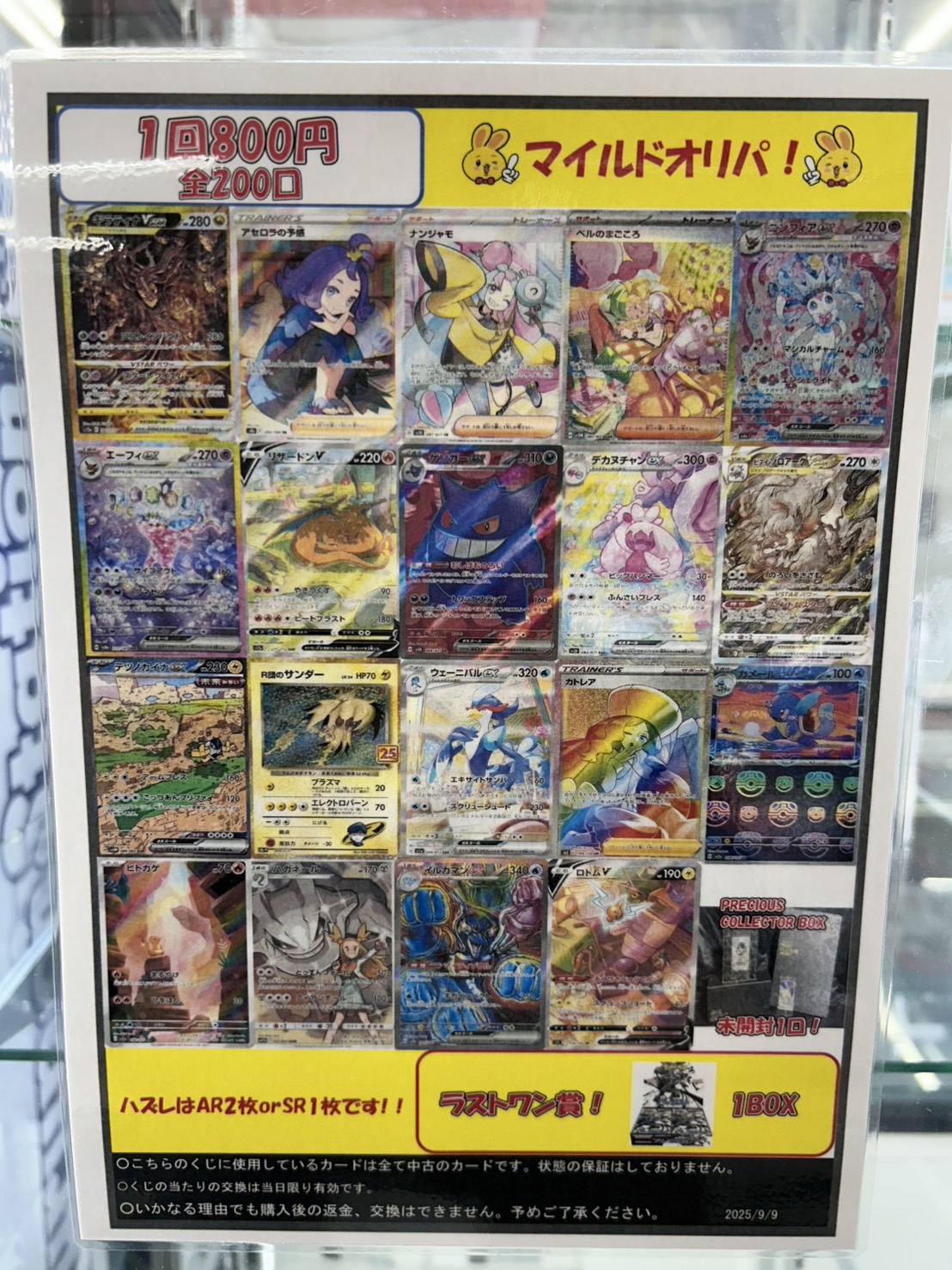 【鈴鹿店】カードコーナーより! マイルドオリパ発売中! 万代書店鈴鹿店 鈴鹿店 カード 2025年9月9日 カードコーナーより! マイルドオリパ発売中! 1回800円 全200口 PRECIOUSCOLLECTOR BOXやギラティナVSTAR UR、アセロラの予感SRなどが当たるチャンス🌟 ラストワン賞はブラックボルト1BOXです🤩