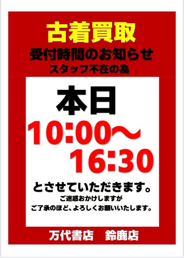 【鈴鹿店】《9/10》古着の査定受付時間変更のお知らせ☆★ 万代書店鈴鹿店 鈴鹿店 買取情報 鈴鹿店 お知らせ/ご案内 鈴鹿店 ファッション 2025年9月10日 いつも万代書店 鈴鹿店をご利用いただき、誠にありがとうございます❗🙇 本日9/10(火)の古着買取時間の 変更をお知らせ致します🙇⋱ ご迷惑をおかけ致しますが、 よろしくお願い致します。