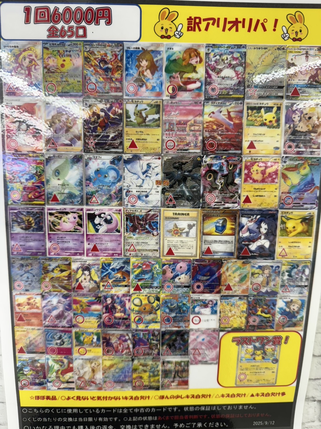 【鈴鹿店】カードコーナーより! ポケモン訳アリオリパ発売中! 万代書店鈴鹿店 鈴鹿店 カード 2025年9月12日 カードコーナーより! ポケモン訳アリオリパ発売中! 1回6000円 全65口 リーリエの全力やピカチュウSAR、ゲッコウガSARなど当たります✨ ラストワンはポンチョを着たピカチュウです🤩
