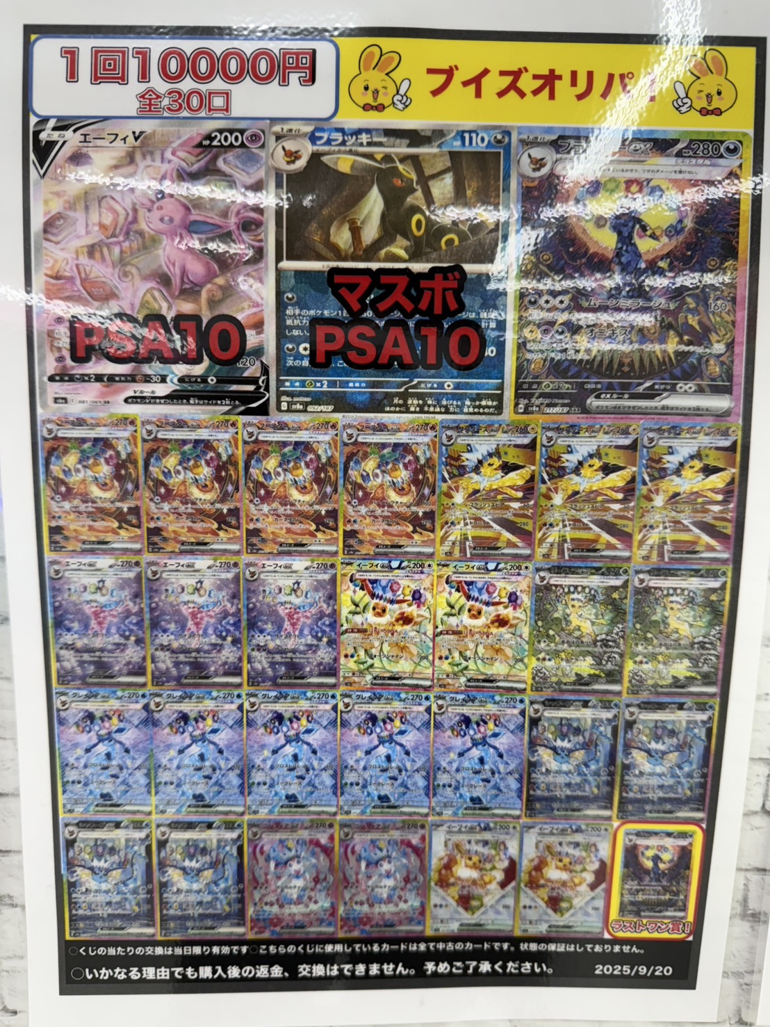 【鈴鹿店】ブイズオリパ発売中! 万代書店鈴鹿店 鈴鹿店 カード 2025年9月21日 カードコーナーより! ブイズオリパ発売中! 1回10000円 全30口 ブラッキーSAR、エーフィSRのPSA10、ブラッキーマスボPSA10など当たります✨ ハズレてもブイズSARが必ず当たる! ラストワン賞はブラッキーSARです🤩