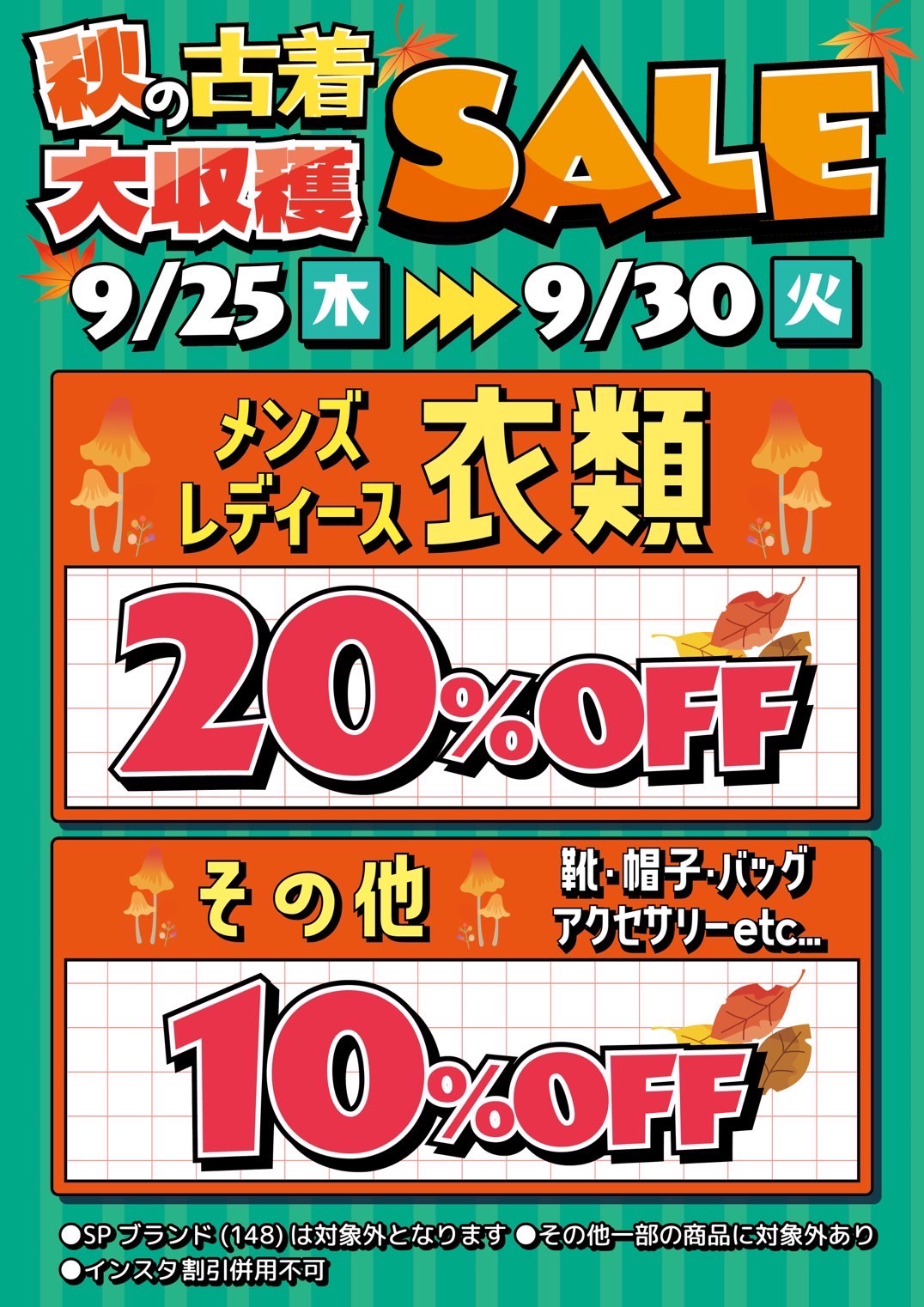 【四日市日永店】古着コーナー《9/25(土)〜9/30(火)》🍄秋の古着大収穫セール🍄 万代書店四日市日永店 四日市日永店 イベント情報 四日市日永店 ファッション 2025年9月22日 万代書店四日市日永店です(☝ ՞ਊ ՞)☝ 9/25(土)〜9/30(火) 🍄秋の古着大収穫セール🍄 ❗️メンズ、レディース衣類品❗️ ✨20%OFF✨ ❗️その他アクセ、靴、カバン等❗️ ✨10%OFF✨ させていただきます🍂 秋冬物がっつり収穫しちゃってください🧑🌾 その他詳細、注意事項は画像の方をご覧くださいませ🗒️ ぜひ、万代書店四日市日永店に お越しくださいませッッ(☝ ՞ਊ ՞)☝✨