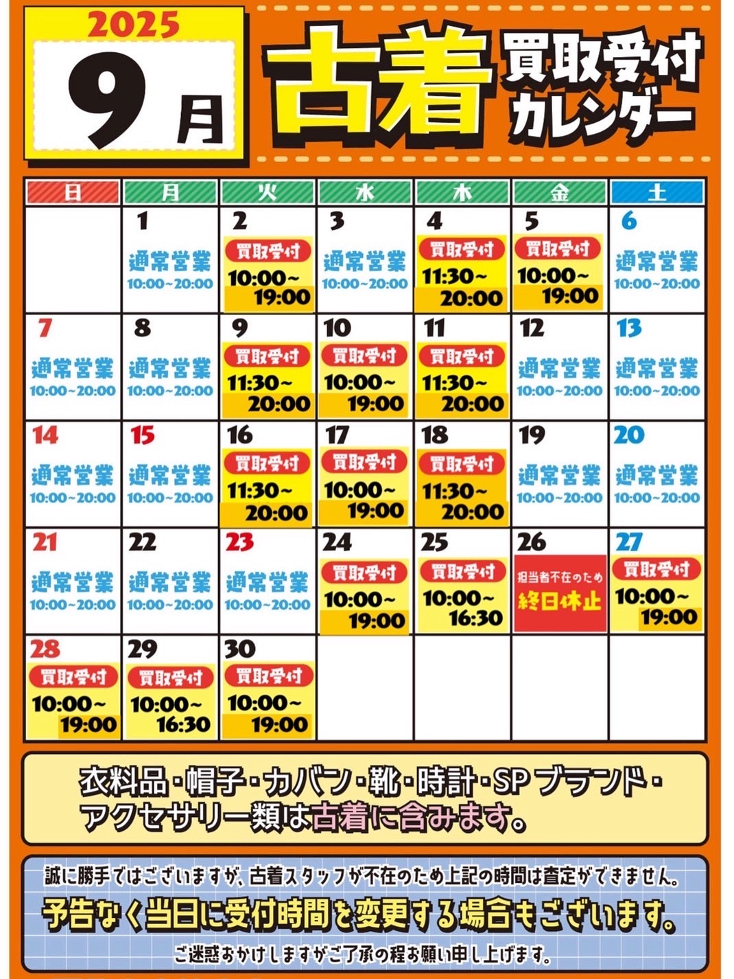【鈴鹿店】9月度の古着買取カレンダーを新しく更新しております🙇♀️ 万代書店鈴鹿店 鈴鹿店 ファッション 2025年9月24日 いつも万代書店 鈴鹿店をご利用いただき、 誠にありがとうございます❗🙇 買取受付時間に変更がありましたので、9月度の古着買取カレンダーを新しく更新しております🙇♀️ ご確認ください🙇♂️ また、予告無く当日に時間変更等させていただく 場合がございます。ご了承下さいませ。