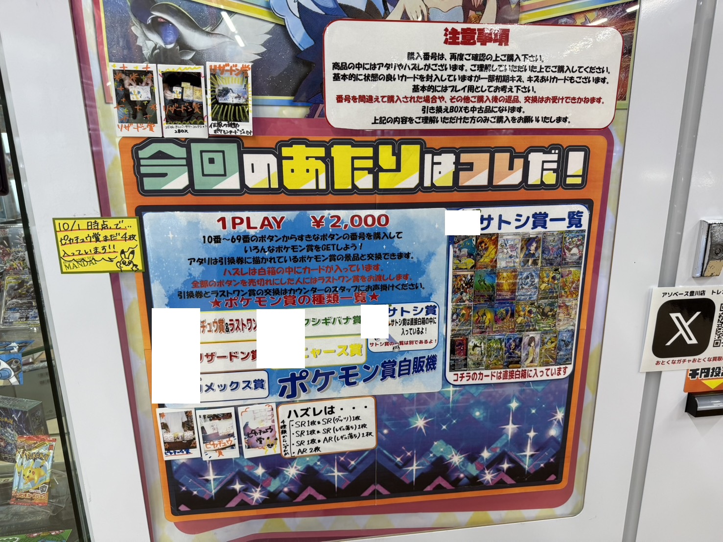 【アソベース豊川店】✨️🆕ポケモン賞自販機🆕✨️ アソベース豊川店 豊川店 カード 豊川店 ガチャ 2025年10月1日 ✨️🆕ポケモン賞自販機🆕✨️ 4回目の途中経過になります〜👏 10/1時点ではまだピカチュウ賞4枚残っております‼️ なんと、話題の蒼空ストリームが買取できましたので、ピカチュウ賞に追加したしました〜🚨🚨🚨🚨 1回2000円になります‼️ ハズレは 🌟SR1枚 レギュ落ちSR1枚 🌟AR2枚 🌟SR1枚 レギュ落ちAR1枚 🌟SR1枚 SRグッツ1枚 のどれかの組み合わせになります✨️