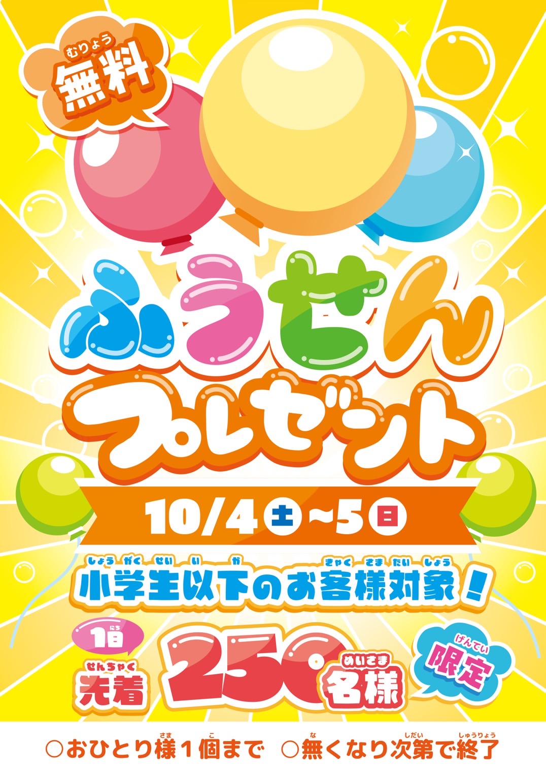 【アソベース豊川店】★《10月4日・5日》小学生以下のお客様に「ふうせんプレゼント!」※先着250名様限定★