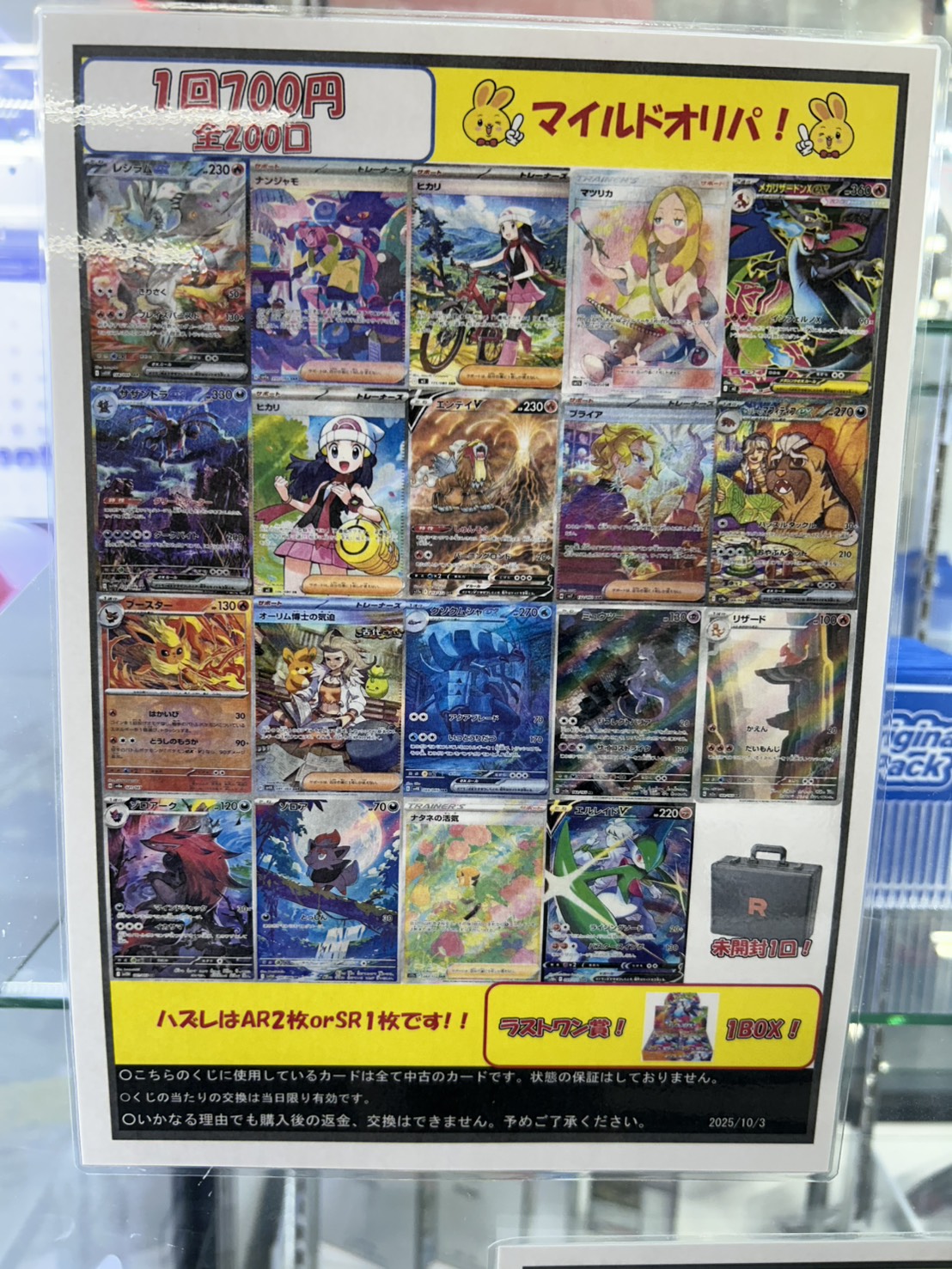 【鈴鹿店】マイルドオリパ発売中!■ 万代書店鈴鹿店 鈴鹿店 カード 鈴鹿店 ガチャ 2025年10月3日 カードコーナーより! マイルドオリパ発売中! 1回700円 全200口 ロケット団の栄光アタッシュケースやレシラムex SAR、ナンジャモSARなどが当たるチャンス🌟 ラストワン賞はインフェルノx1BOXです🤩