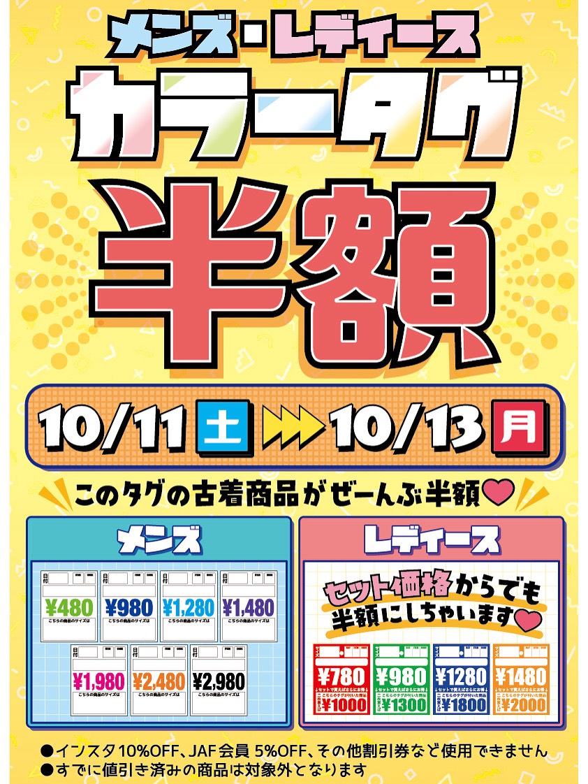 【鈴鹿店】《10月11日~13日》★《古着》メンズ、レディースカラータグアイテム全品 50%offセールを開催★ new 万代書店鈴鹿店 鈴鹿店 イベント情報 鈴鹿店 ファッション 2025年10月10日 いつも万代書店 鈴鹿店をご利用いただき、誠にありがとうございます❗🙇 今週末10/11~13日の3日間 古着コーナーにて メンズ、レディースカラータグアイテム全品 50%offセールを開催いたします🉐🔥🔥🔥 ※インスタ割、JAF割、他割引券との 併用は不可となります。 ぜひ3連休皆さま遊びに来てください‼️🙏 ご来店お待ちしてます😌👕👚 **************** こちら↓もぜひチェックしてみてくださいね♪(*´▽`*) ・最新のイベント情報はこちら ・最新の買取情報はこちら