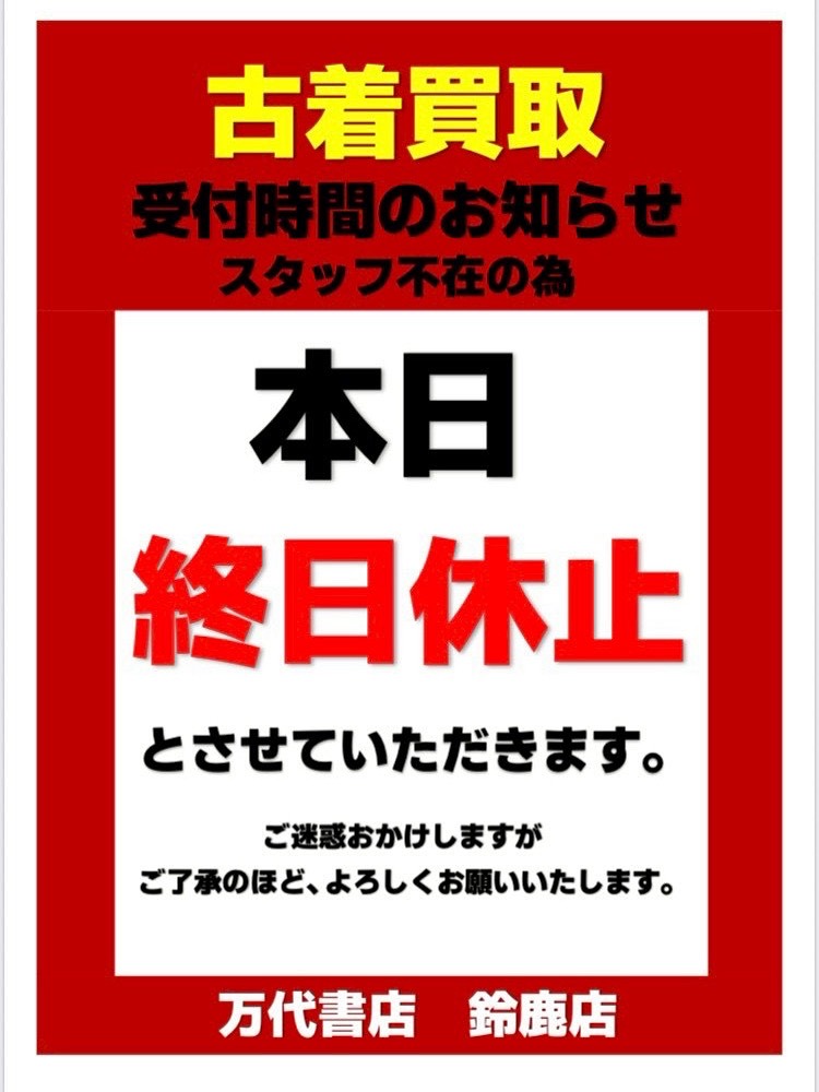 【鈴鹿店】《10月10日》古着コーナー本日の買取査定は終日休止に変更させていただきます■ 万代書店鈴鹿店 鈴鹿店 買取情報 鈴鹿店 お知らせ/ご案内 鈴鹿店 ファッション 2025年10月10日 いつも万代書店 鈴鹿店をご利用いただき、誠にありがとうございます❗🙇 本日の買取査定は終日休止に変更させていただきます。 連日お客様には大変ご迷惑をお掛けいたしますが、ご理解・ご了承のほどよろしくお願いいたします。
