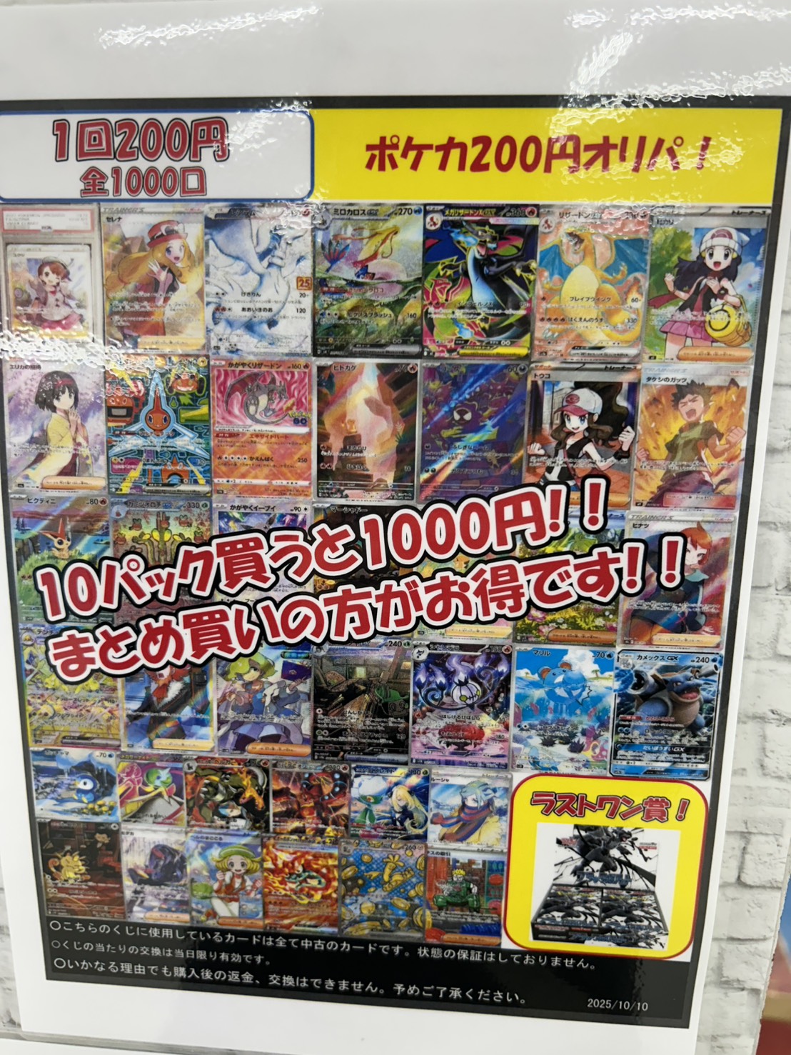 【鈴鹿店】 ポケカ200円オリパ発売中🌟 万代書店鈴鹿店 鈴鹿店 カード 鈴鹿店 ガチャ 2025年10月10日 カードコーナーより! ポケカ200円オリパ発売中🌟 1回200円 全1000口 10パック買うと1000円になるのでまとめ買いがお得です✨ ユウリSR PSA10やセレナSR、レシラム(25th)などが当たるチャンスです! ラストワン賞はブラックボルト1BOXです🌟