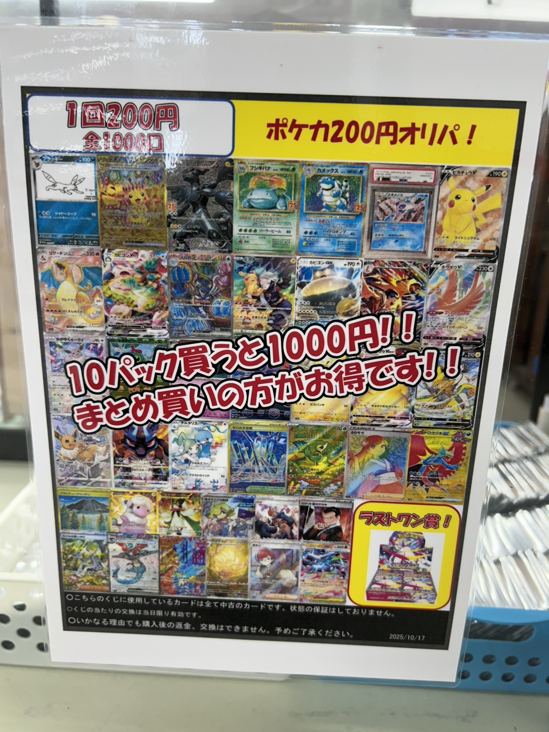 【鈴鹿店】ポケカオリパ情報です!■ 万代書店鈴鹿店 鈴鹿店 カード 鈴鹿店 ガチャ 2025年10月17日 カードコーナーより! ポケカ200円オリパ発売中🌟 1回200円 全1000口 10パック買うと1000円になるのでまとめ買いがお得です✨ YU NAGABAブラッキーやピカチュウex URなどが当たるチャンスです! ラストワン賞はメガシンフォニア1BOXです🌟
