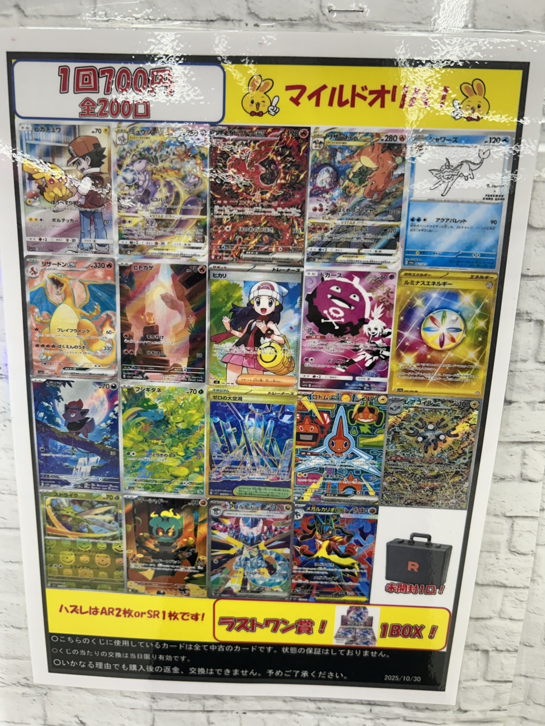 【鈴鹿店】カードコーナーより!マイルドオリパ発売中!■ 万代書店鈴鹿店 鈴鹿店 カード 鈴鹿店 ガチャ 2025年10月30日 カードコーナーより!マイルドオリパ発売中! 1回700円 全200口 ロケット団の栄光アタッシュケースやピカチュウCHR、ミュウツーVSTAR SARなどが当たるチャンス🌟 ラストワン賞はタイムゲイザー1BOXです🤩