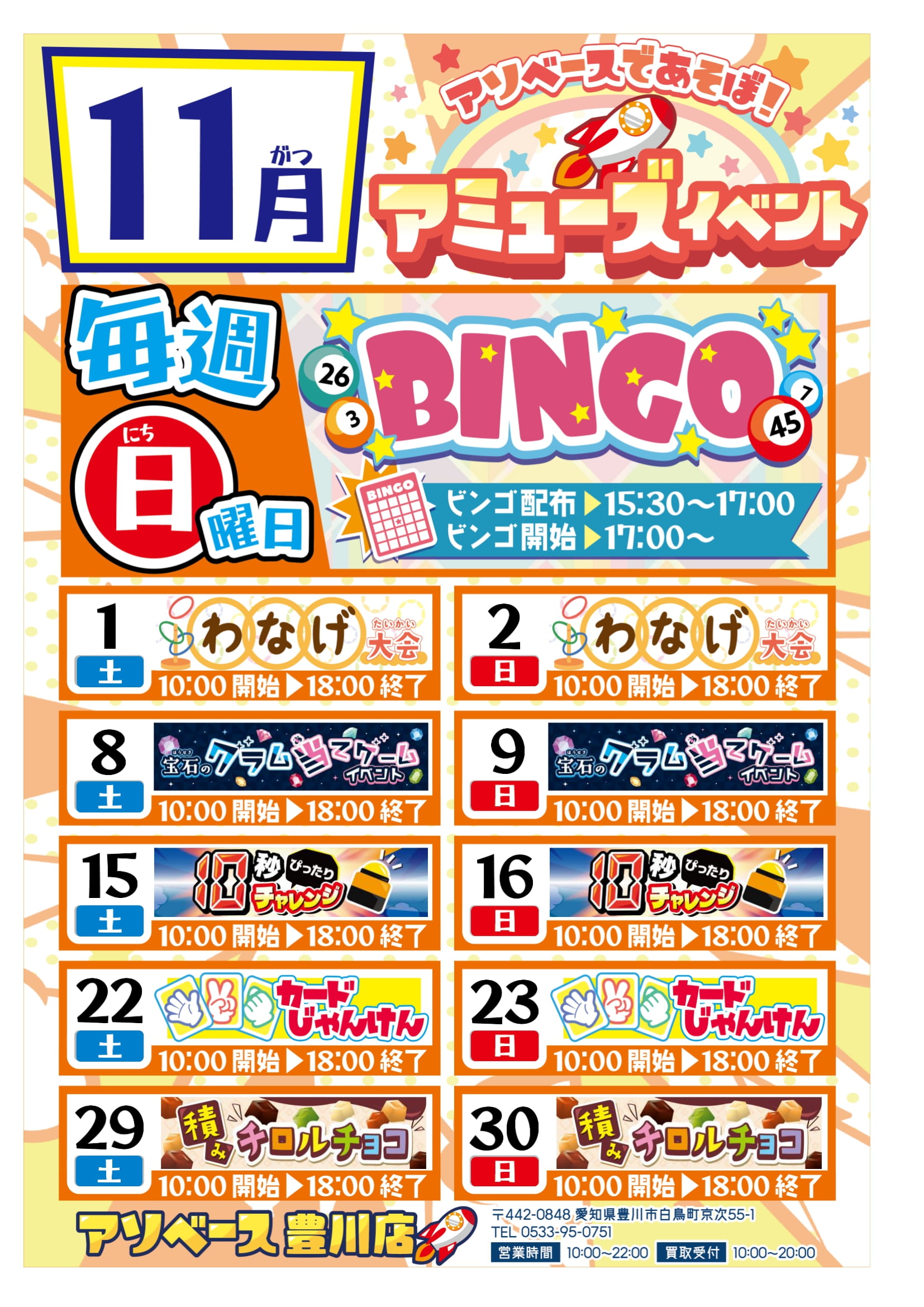 【アソベース豊川店】★11月イベントカレンダー★ new アソベース豊川店 豊川店 イベント情報 豊川店 アミューズ 2025年11月8日 ★11月イベントカレンダー★ **************** こちら↓もぜひチェックしてみてくださいね♪(*´▽`*) ・最新のイベント情報はこちら ・最新の買取情報はこちら