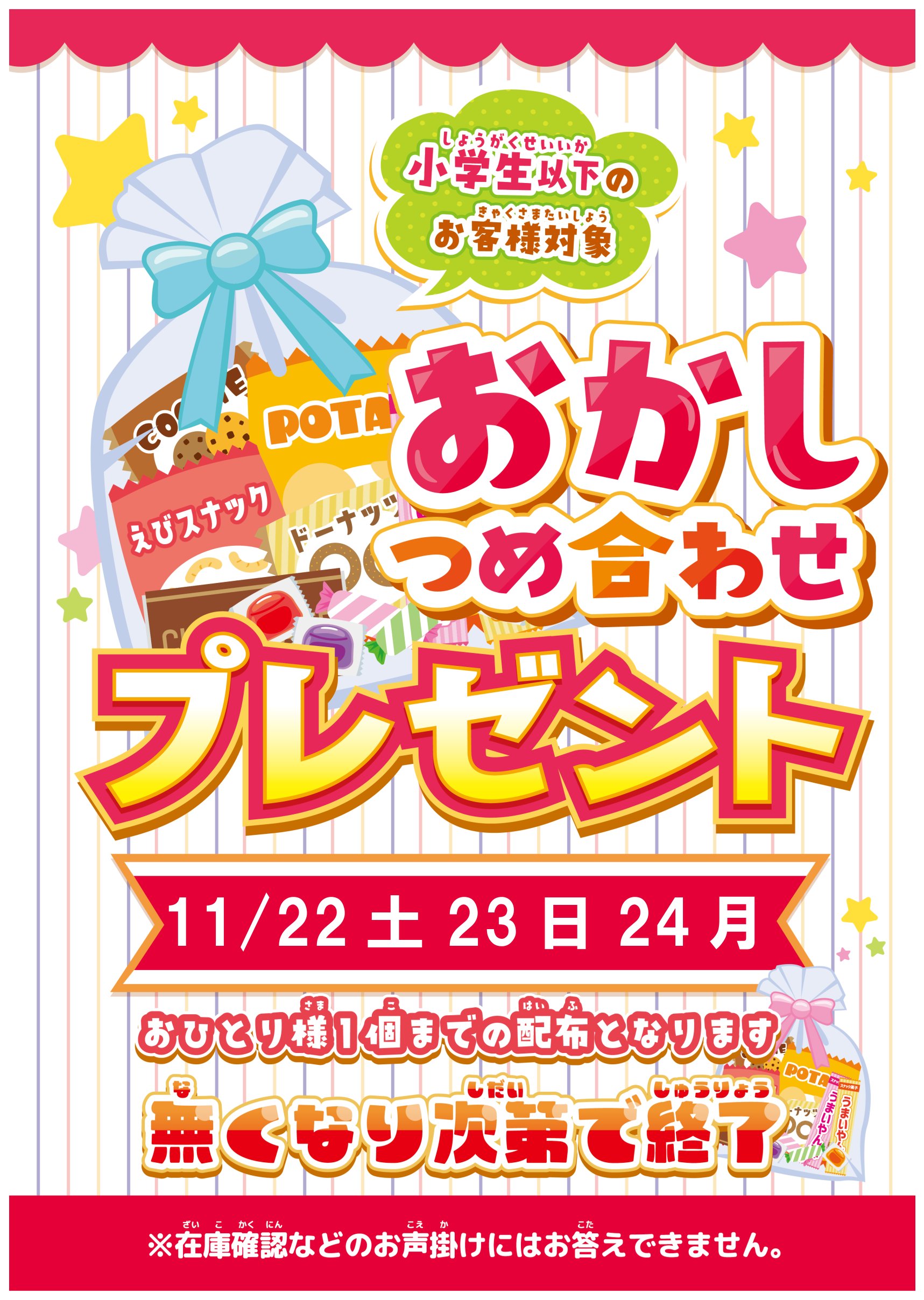 【アソベース豊川店】11/23土24日25月お菓子詰め合わせプレゼント(なくなり次第終了) new アソベース豊川店 豊川店 イベント情報 2025年11月9日 11/23土24日25月お菓子詰め合わせプレゼント!! ※小学生以下のお客様 ※お一人様1個 ※なくなり次第終了 ご来店お待ちしています!! **************** こちら↓もぜひチェックしてみてくださいね♪(*´▽`*) ・最新のイベント情報はこちら ・最新の買取情報はこちら