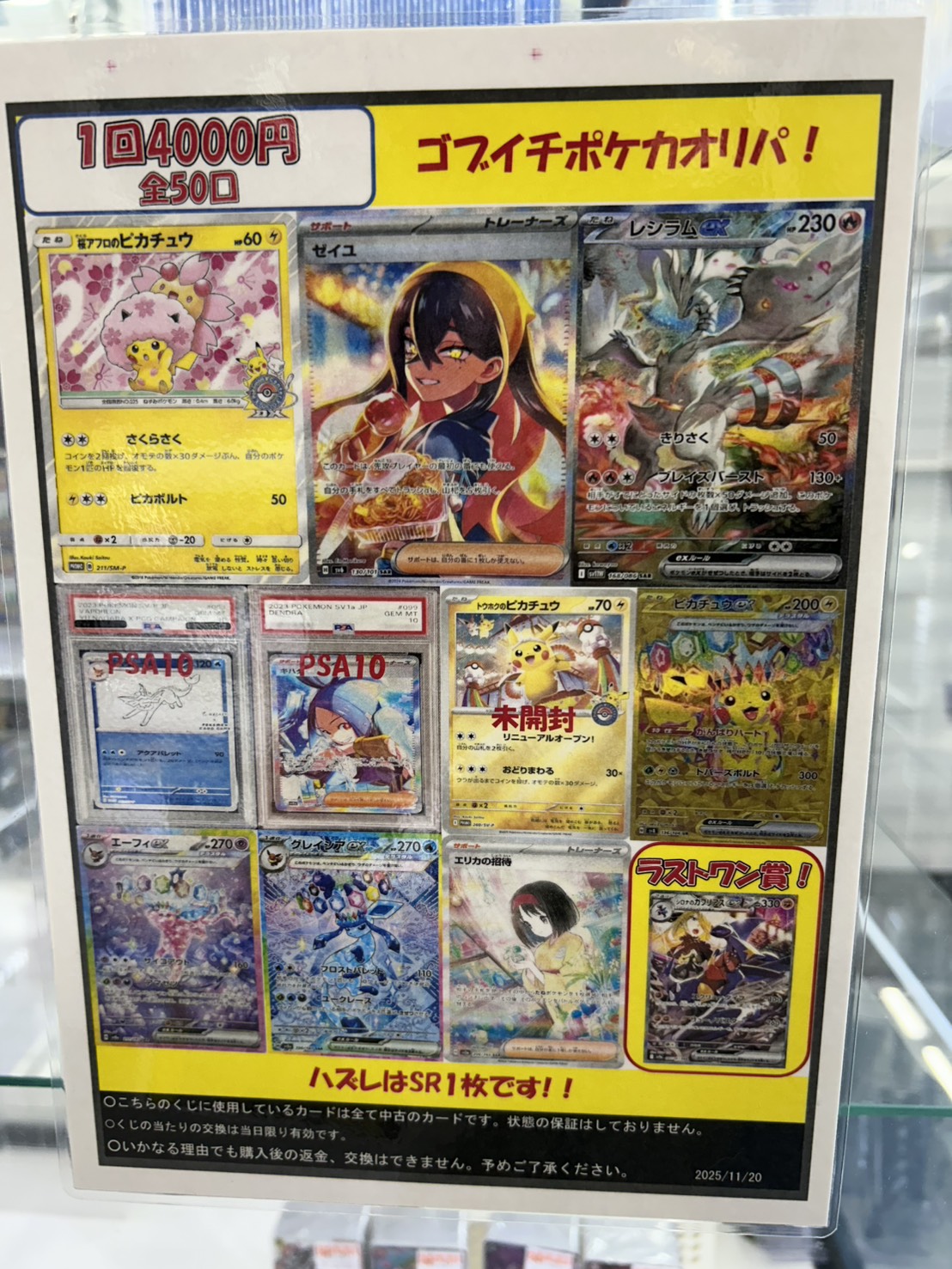 【鈴鹿店】ゴブイチオリパ発売中!■ 万代書店鈴鹿店 鈴鹿店 カード 2025年11月20日 カードコーナーより! ゴブイチオリパ発売中! 1回4000円 全50口! 桜アフロのピカチュウやゼイユSAR、レシラムex SARなどがゴブイチで当たるチャンス✨ ラストワンはシロナのガブリアスex SARです!