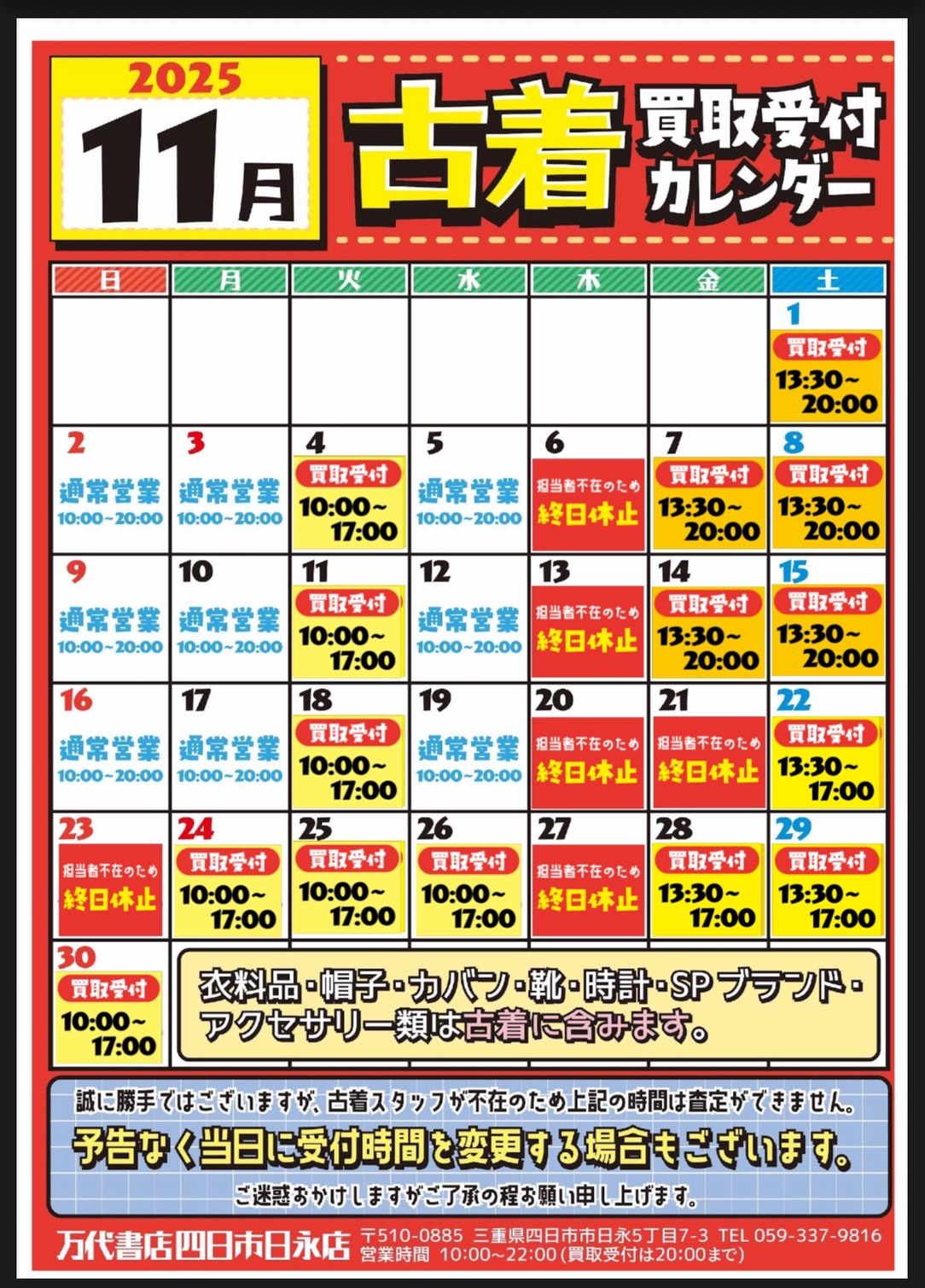 【四日市日永店】古着コーナー 買取カレンダー変更してます 万代書店四日市日永店 四日市日永店 ファッション 2025年11月21日 万代書店四日市日永店 古着コーナー 買取カレンダー変更してます🙇 ご迷惑をおかけしてしまい申し訳ございませんがよろしくお願いします🤲