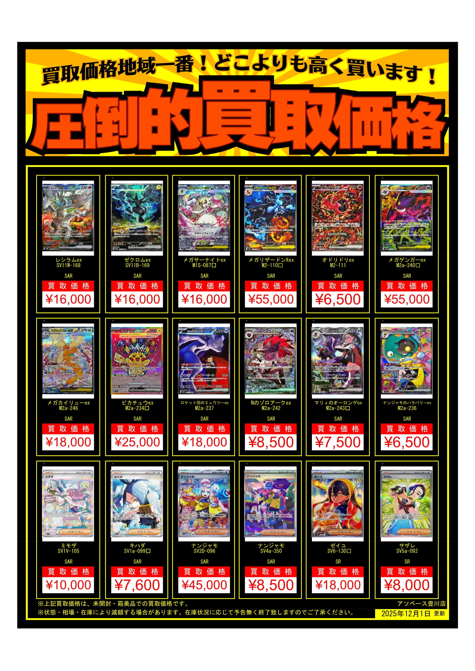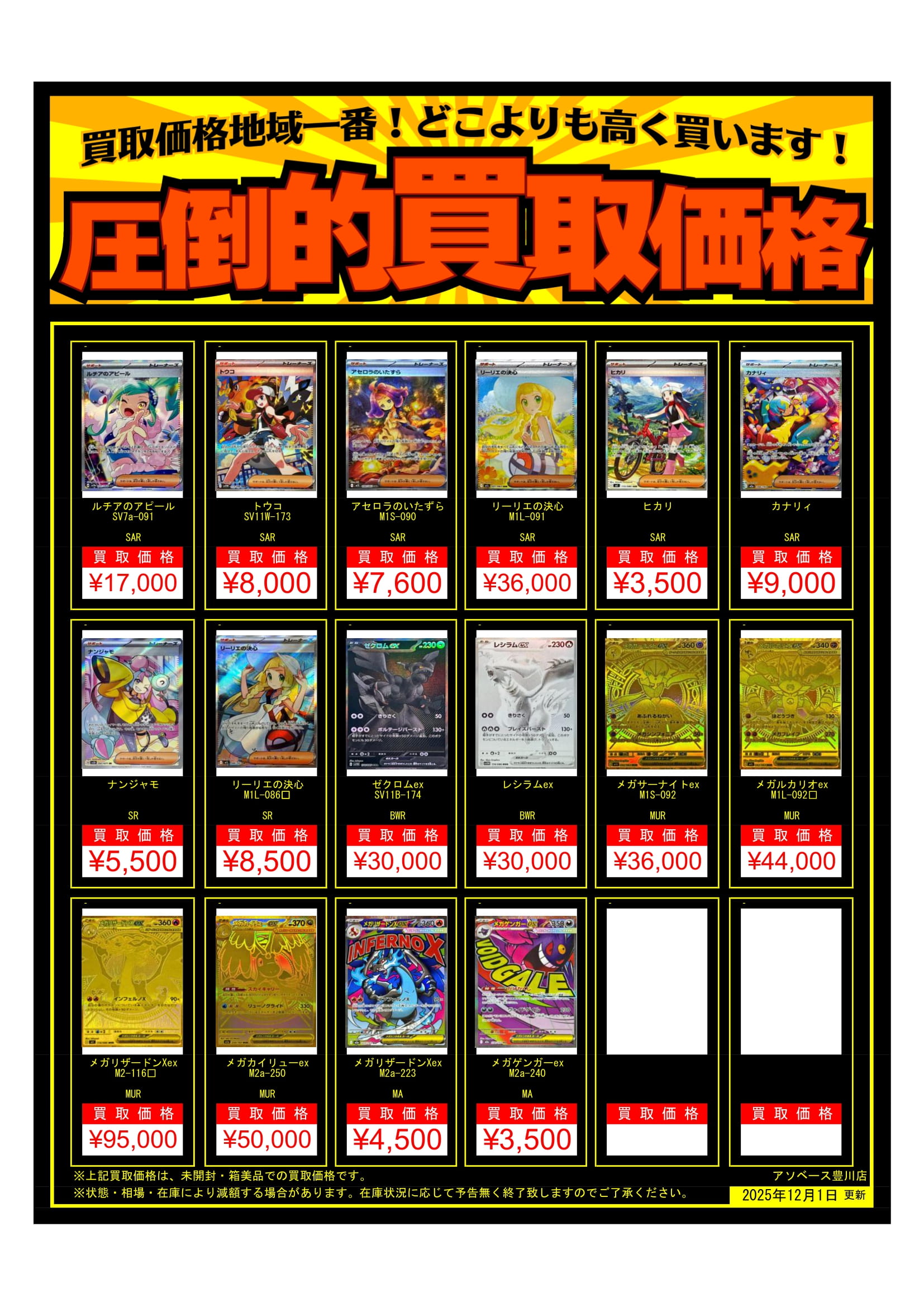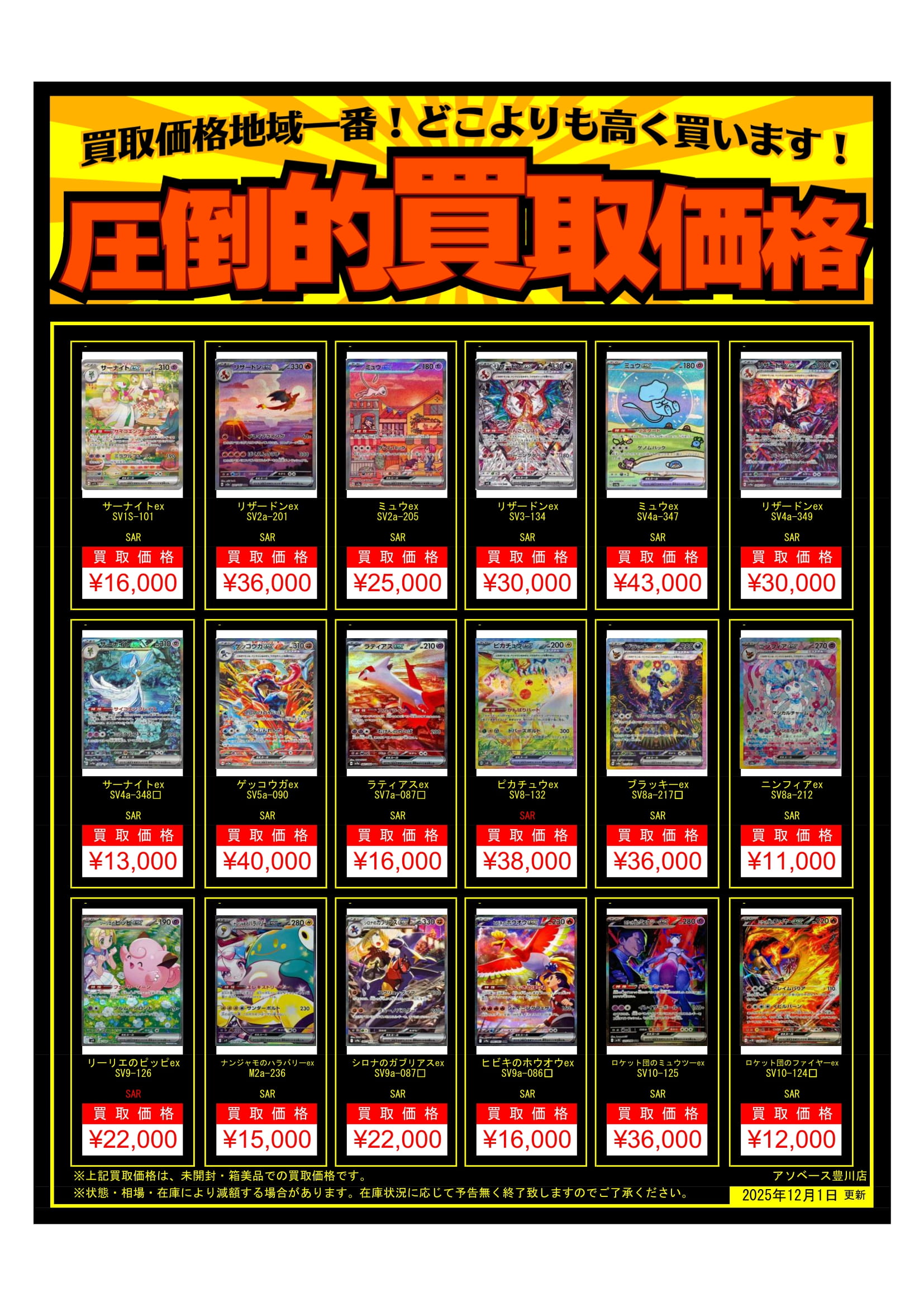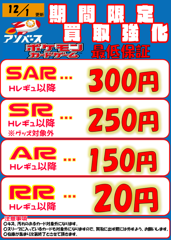 【アソベース豊川店】★ポケモンカード買取告知★ new アソベース豊川店 豊川店 買取情報 豊川店 カード 2025年12月1日 ★買取情報★ ※2025/12/1現在の価格となります。 在庫状況・状態によってお値段が変動いたします。予めご了承ください。 **************** こちら↓もぜひチェックしてみてくださいね♪(*´▽`*) ・最新のイベント情報はこちら ・最新の買取情報はこちら
