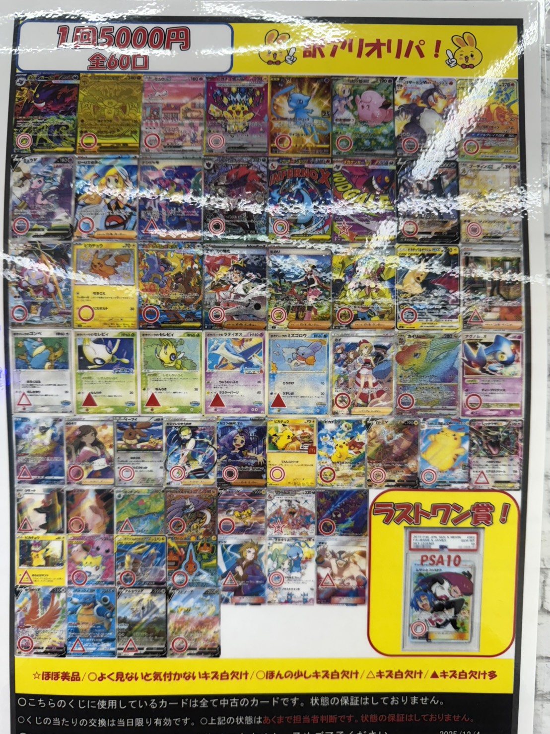 【鈴鹿店】カードコーナーより!ポケカ訳アリオリパ発売中!■ 万代書店鈴鹿店 鈴鹿店 カード 鈴鹿店 ガチャ 2025年12月4日 カードコーナーより!ポケカ訳アリオリパ発売中! 1回5000円 全60口 メガゲンガーex SARやメガルカリオMURなど🌟 ラストワン賞はムサシとコジロウPSA10です🤩