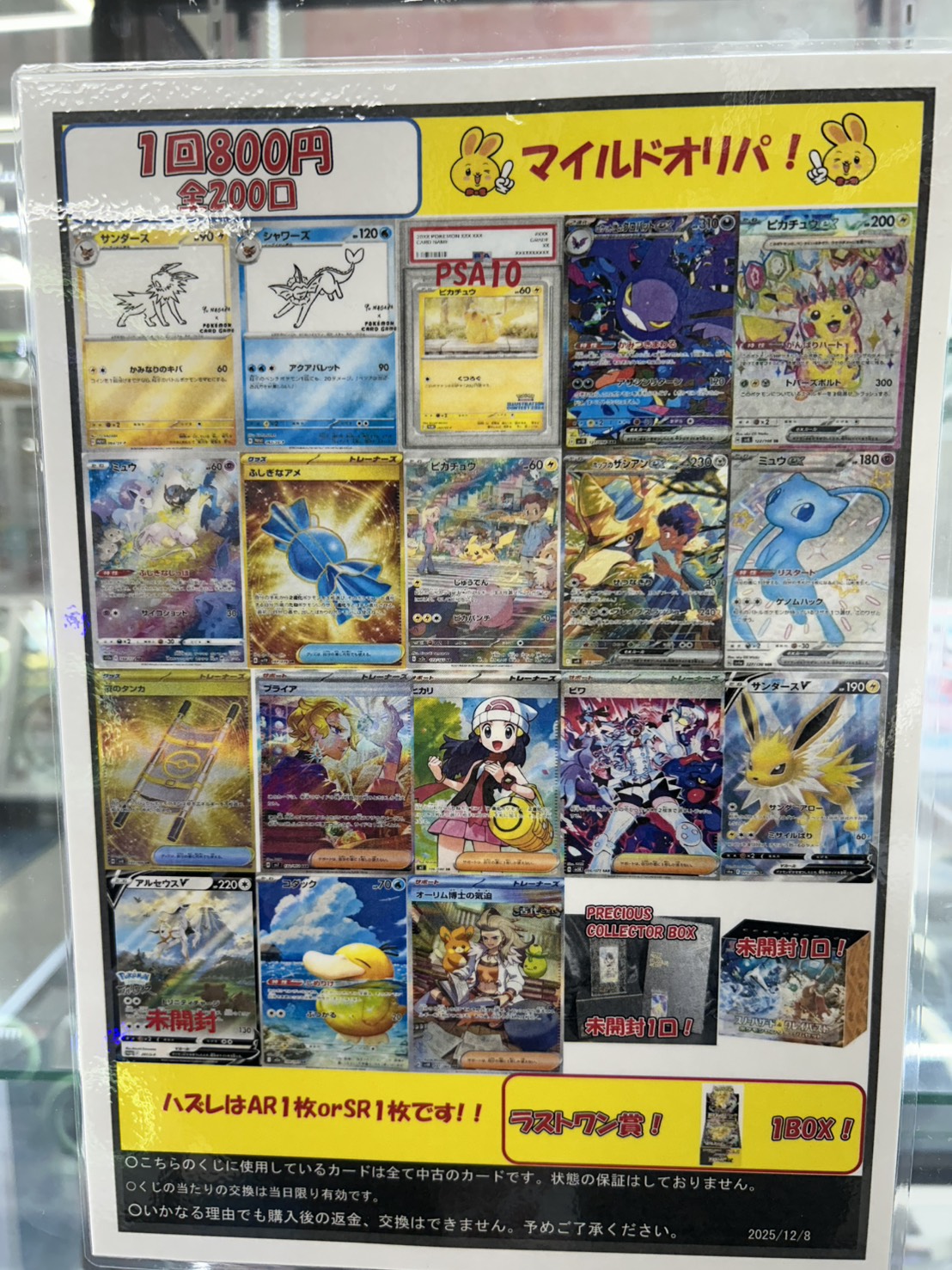 【鈴鹿店】カードコーナーより! マイルドオリパ発売中!■ 万代書店鈴鹿店 鈴鹿店 カード 鈴鹿店 ガチャ 2025年12月9日 カードコーナーより! マイルドオリパ発売中! 1回800円 全200口 PRECIOUSCOLLECTOR BOXやスノーハザード&クレイバースト ポケモンセンタージムセット、ピカチュウ 242/SV-Pなどが当たるチャンス🌟 ラストワン賞はメガドリーム1BOXです🤩