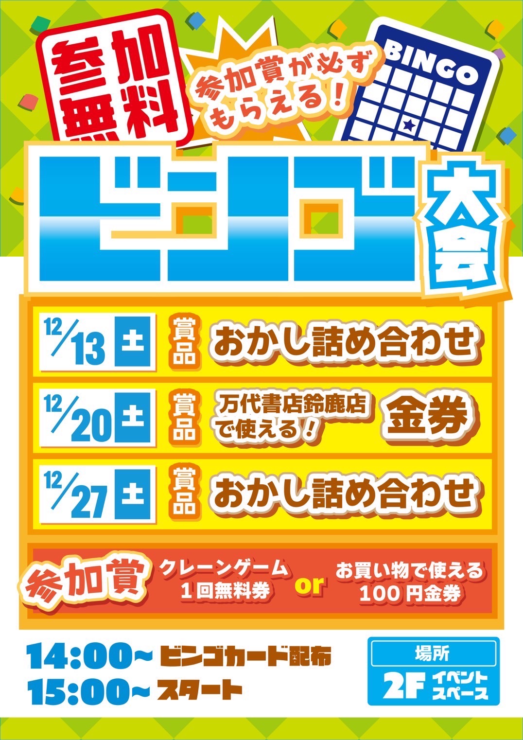 【鈴鹿店】■ビンゴイベント開催!【12月13日・12月20日・12月27日】