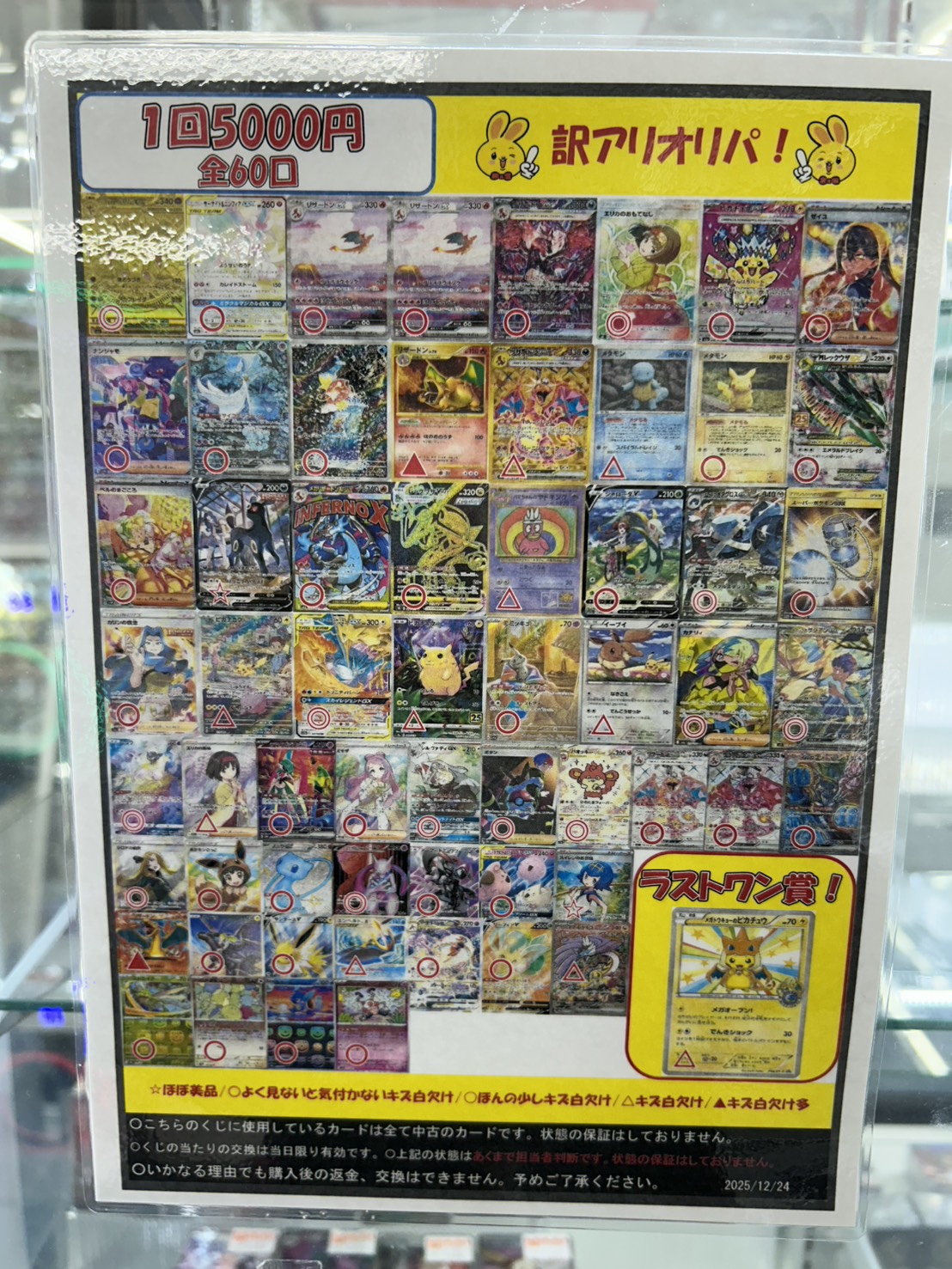 【鈴鹿店】ポケカ訳アリオリパ発売中!■ 万代書店鈴鹿店 鈴鹿店 カード 鈴鹿店 ガチャ 2025年12月25日 カードコーナーより! ポケカ訳アリオリパ発売中! 1回5000円 全60口 メガルカリオex MURやサーナイト&ニンフィアGX SR、リザードンex SARなど🌟 ラストワン賞はメガトウキョーのピカチュウです🤩