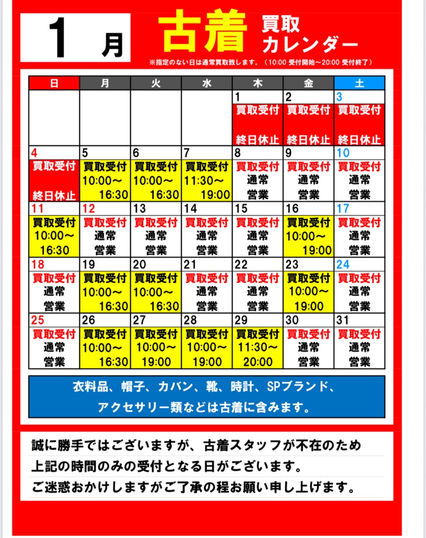 【鈴鹿店】2026年1月度 古着買取カレンダー new 万代書店鈴鹿店 鈴鹿店 ファッション 2026年1月5日 いつも万代書店 鈴鹿店をご利用いただき、 誠にありがとうございます❗🙇 1月度の古着買取カレンダーになります🎄🎁🎅⛄️❄️ ダウンなど冬物アイテム中心に買取を強化してお待ちしてます‼️ 色んな商品買わせてください😇 皆様のご来店心よりお待ちしております❗️ 予告無く当日に時間変更等させていただく 場合がございます。ご了承下さいませ。