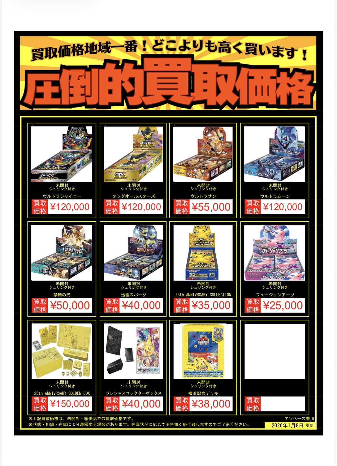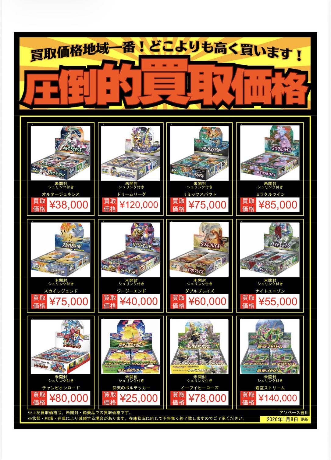 【アソベース豊川店】ポケモンカードゲーム 買取情報です! アソベース豊川店 豊川店 買取情報 豊川店 カード 2026年1月8日 ★買取情報★ ※2026/1/8現在の価格となります。 在庫状況・状態によってお値段が変動いたします。予めご了承ください。 **************** こちら↓もぜひチェックしてみてくださいね♪(*´▽`*) ・最新のイベント情報はこちら ・最新の買取情報はこちら