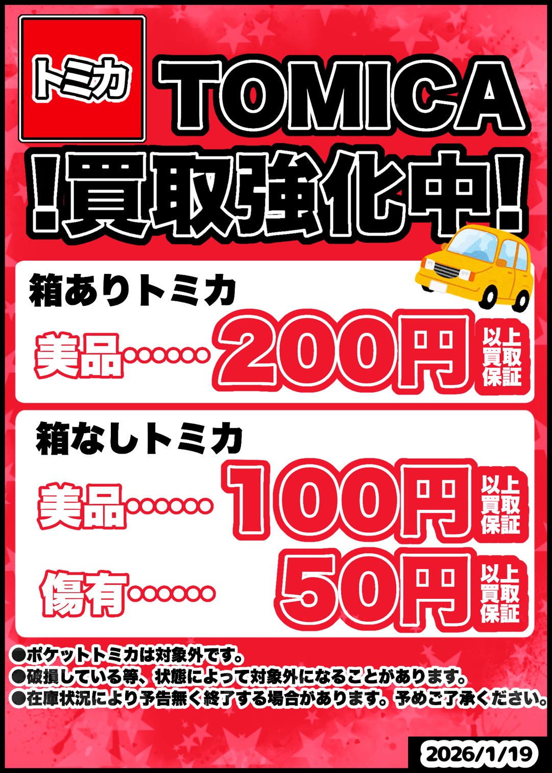 【鈴鹿店】トミカ最低買取保証スタートしています! new 万代書店鈴鹿店 鈴鹿店 買取情報 鈴鹿店 おもちゃ 2026年1月19日 トミカ最低買取保証スタートしています! 箱無し、箱有り問わず買取させていただきます‼️ お子さまが遊び終わったおもちゃなど、お家で眠っていませんか? ぜひぜひ万代書店鈴鹿店へお売りください‼️✨️ ※2026/1/19現在の価格となります。★ 在庫状況・状態によってお値段が変動いたします。予めご了承ください。 **************** こちら↓もぜひチェックしてみてくださいね♪(*´▽`*) ・最新のイベント情報はこちら ・最新の買取情報はこちら