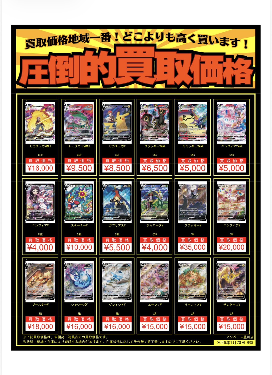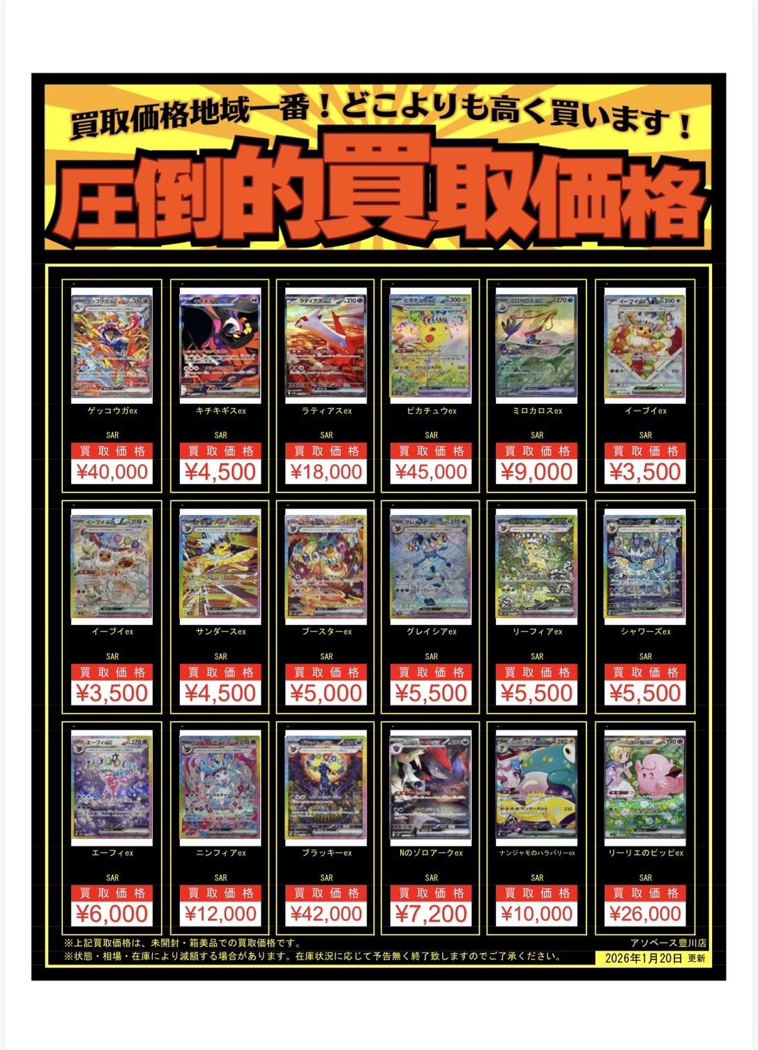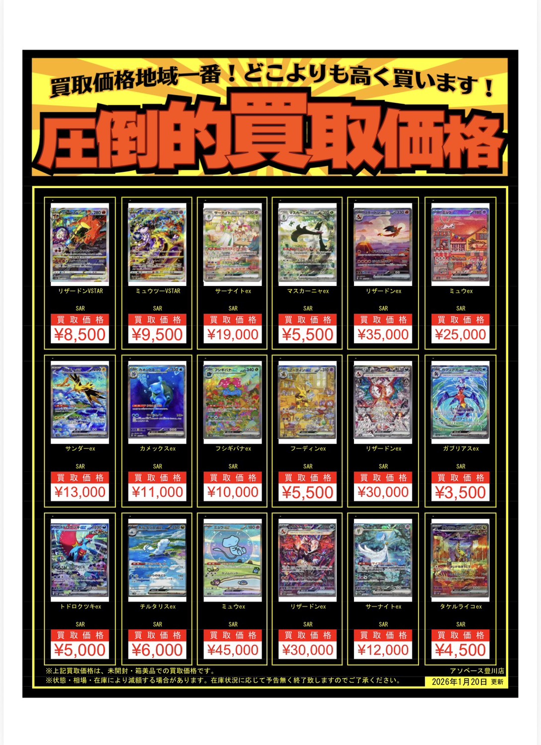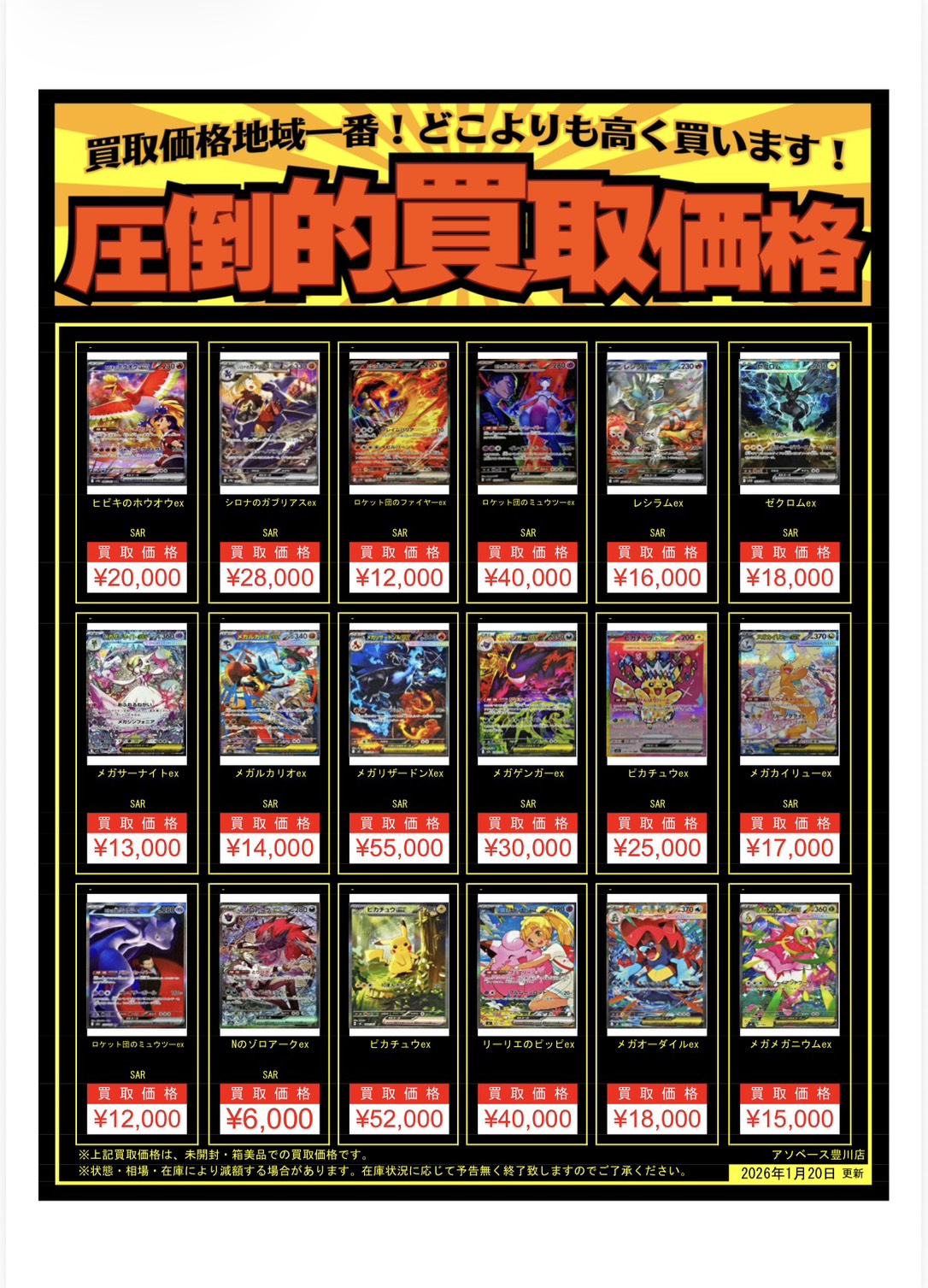 【アソベース豊川店】ポケモンカードゲーム 買取情報です! アソベース豊川店 豊川店 買取情報 豊川店 カード 2026年1月20日 ★買取情報★ ※2026/1/20現在の価格となります。 在庫状況・状態によってお値段が変動いたします。予めご了承ください。 **************** こちら↓もぜひチェックしてみてくださいね♪(*´▽`*) ・最新のイベント情報はこちら ・最新の買取情報はこちら