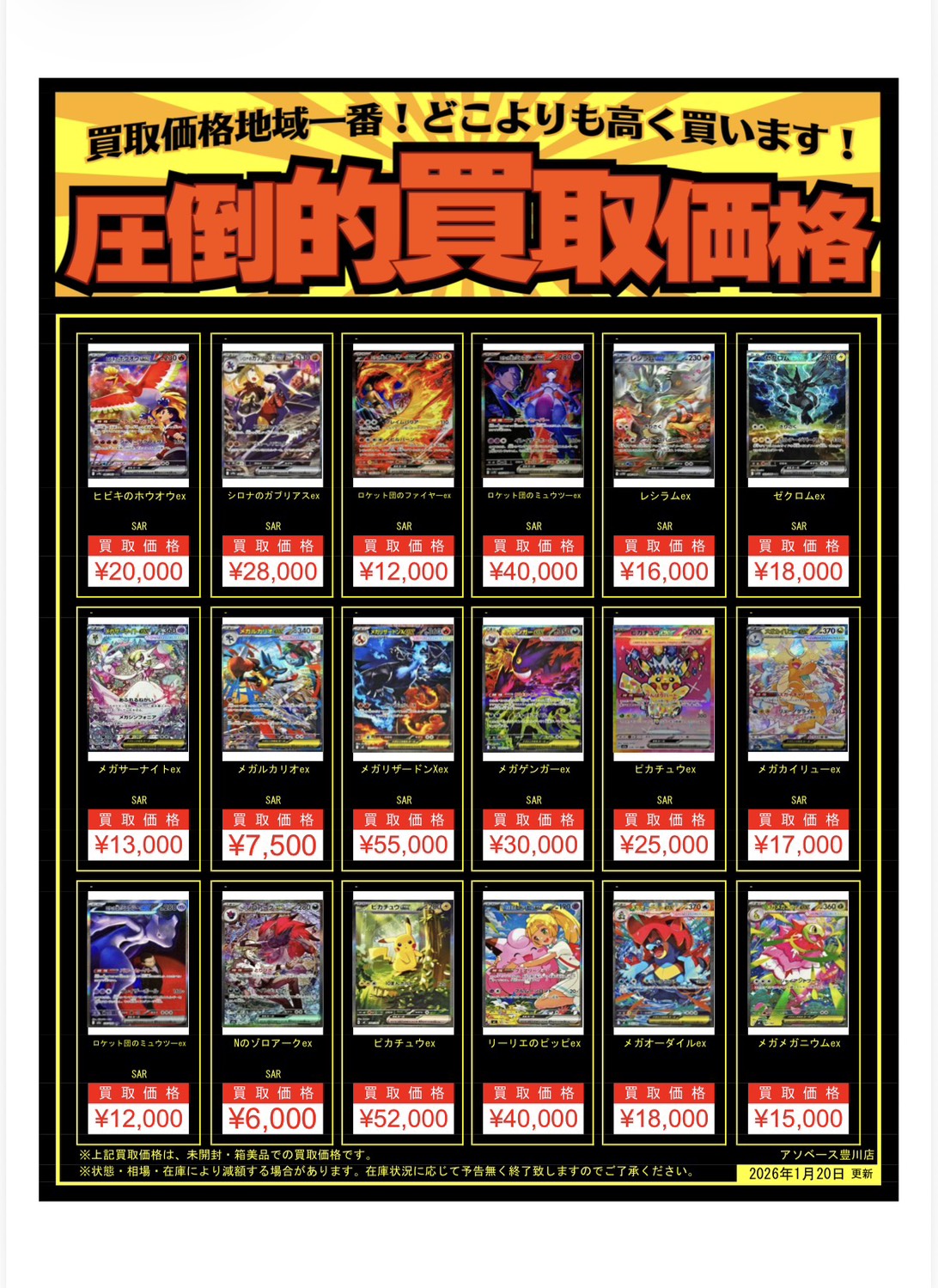 【アソベース豊川店】ポケモンカード 買取情報です! アソベース豊川店 豊川店 買取情報 豊川店 カード 2026年1月22日 ★買取情報★ ※2026/1/22現在の価格となります。 在庫状況・状態によってお値段が変動いたします。予めご了承ください。 **************** こちら↓もぜひチェックしてみてくださいね♪(*´▽`*) ・最新のイベント情報はこちら ・最新の買取情報はこちら