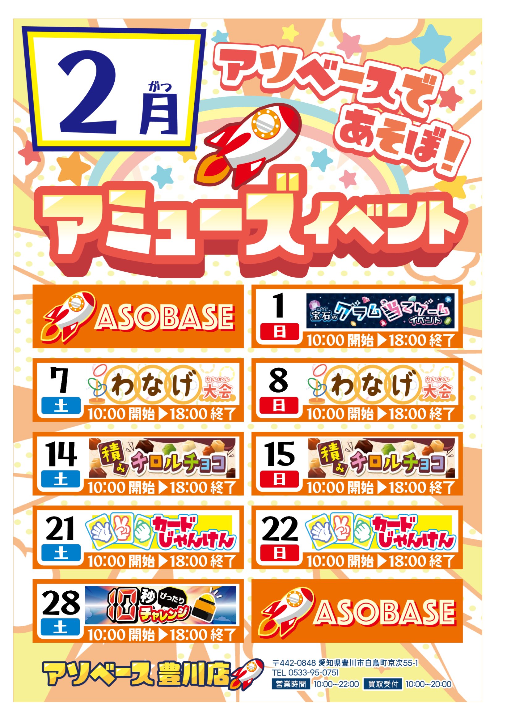 【アソベース豊川店】★2月開催イベント一覧★ new アソベース豊川店 豊川店 イベント情報 2026年2月3日 ★イベント情報★ **************** こちら↓もぜひチェックしてみてくださいね♪(*´▽`*) ・最新のイベント情報はこちら ・最新の買取情報はこちら