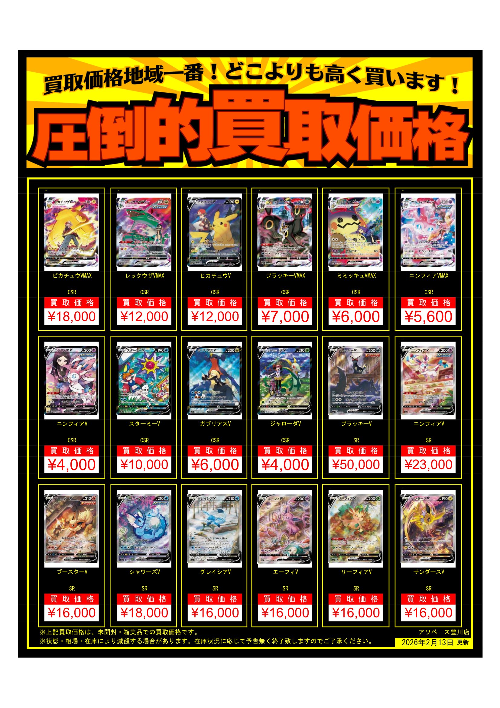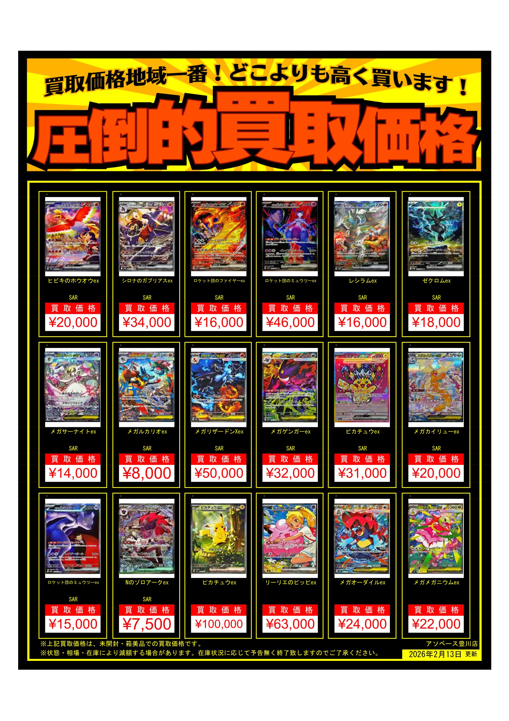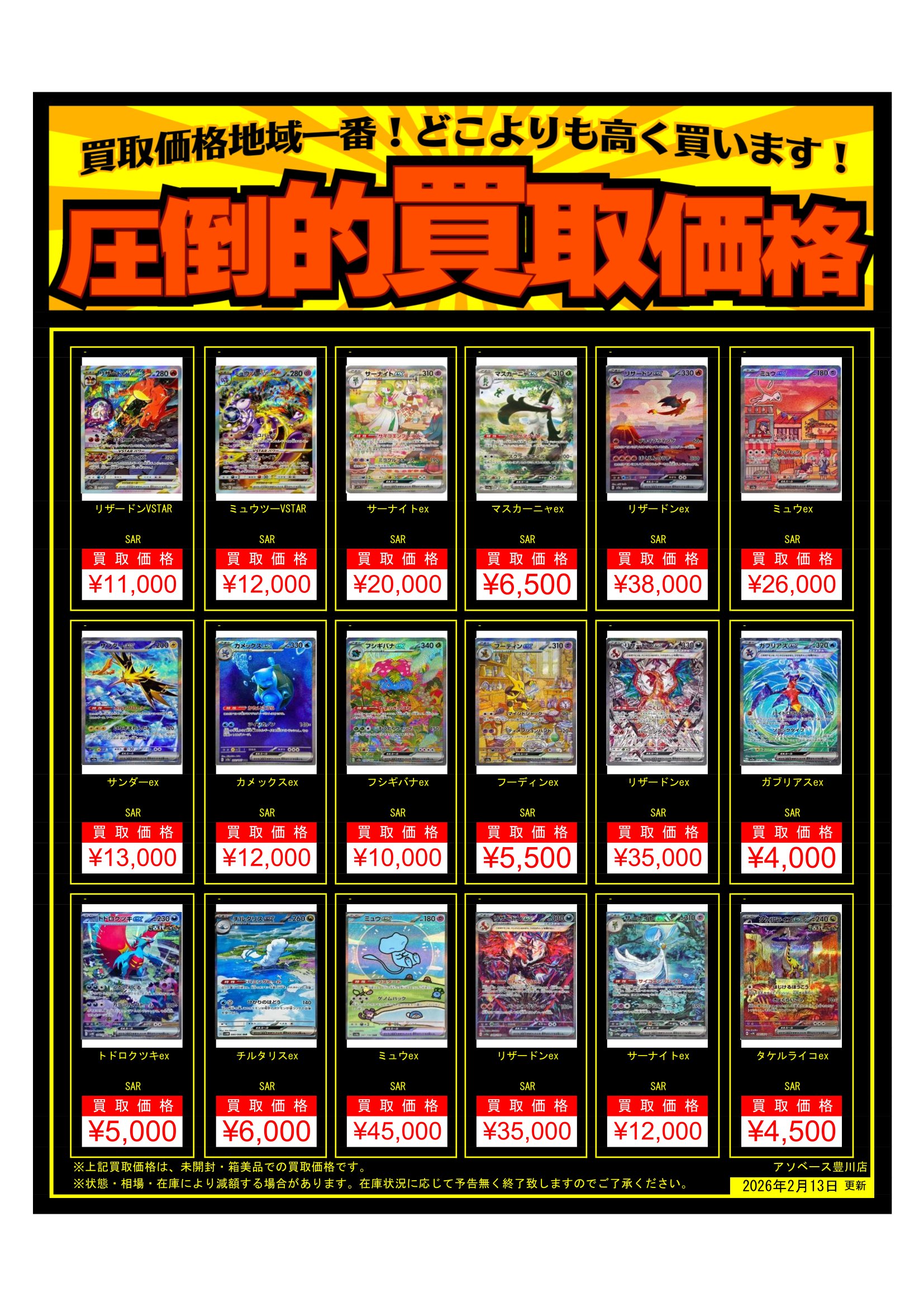 【アソベース豊川店】★ポケモンカード買取告知★ new アソベース豊川店 豊川店 買取情報 豊川店 カード 2026年2月13日 ★買取情報★ ※2026/2/13現在の価格となります。 在庫状況・状態によってお値段が変動いたします。予めご了承ください。 **************** こちら↓もぜひチェックしてみてくださいね♪(*´▽`*) ・最新のイベント情報はこちら ・最新の買取情報はこちら
